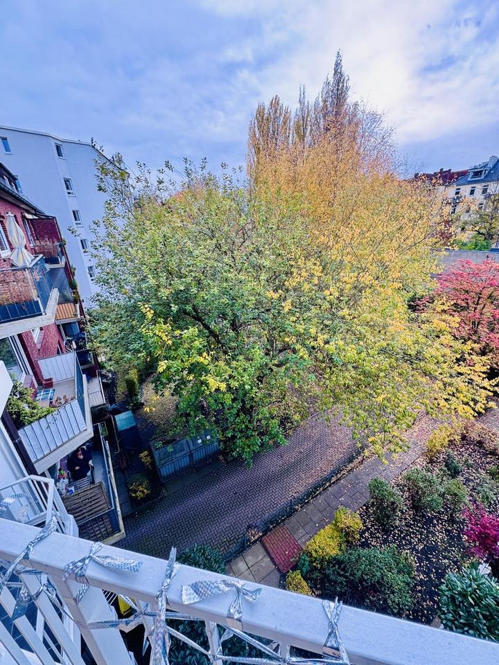 Die Wohnung orientiert sich zum begrünten Innenhof. Dadurch entsteht eine seltene Kombination: innenstadtnah wohnen, auf dem Balkon dennoch ins Grüne blicken. Rund um den Mühlenkamp finden sich Cafés, Wochenmarkt, Lebensmittelhandwerk, Apotheken sowie alle Dinge des täglichen Bedarfs. Der Winterhuder Marktplatz, der Goldbekkanal und die Alsterufer sind bequem zu Fuß erreichbar; der Stadtpark liegt nur wenige Fahrradminuten entfernt.