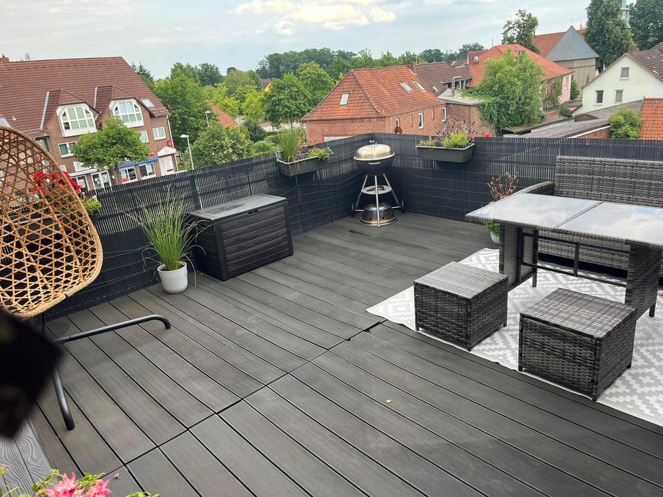 eine Küche mit direktem Zugang zur ca. 20qm großen Terrasse.