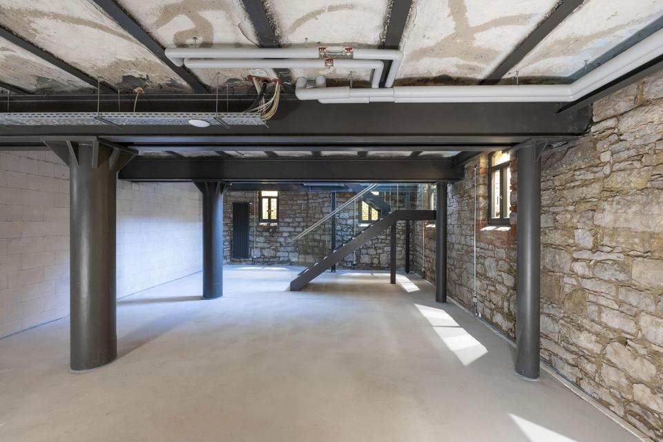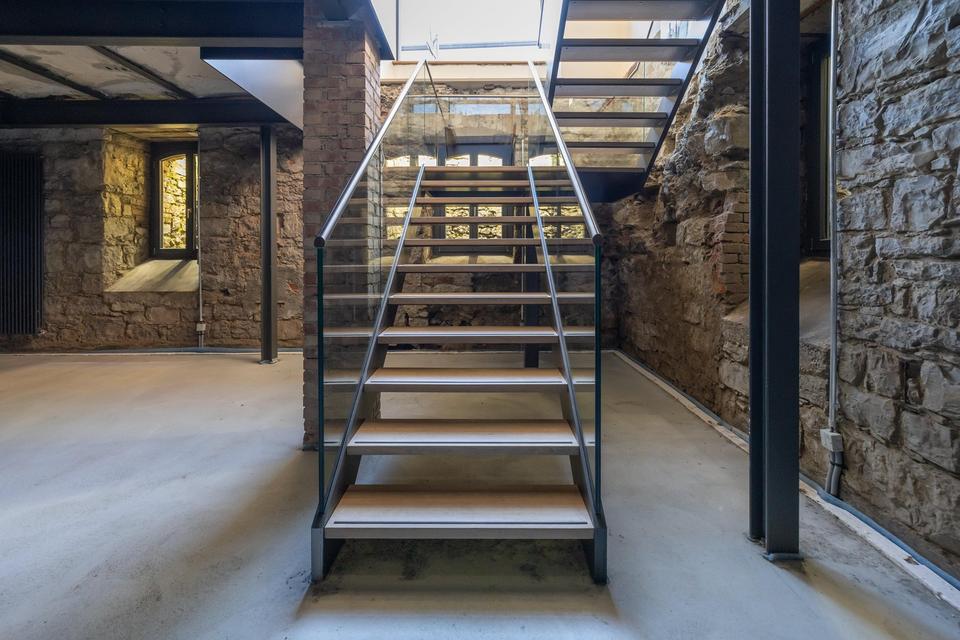 82 m² UG / 77 m² EG, verbunden über innenliegende neue Treppenanlage (Stahl mit Ganzglasgeländer), Raumhöhe ca. 3,30 m im UG, Raumhöhe im EG ca. 3,70 m