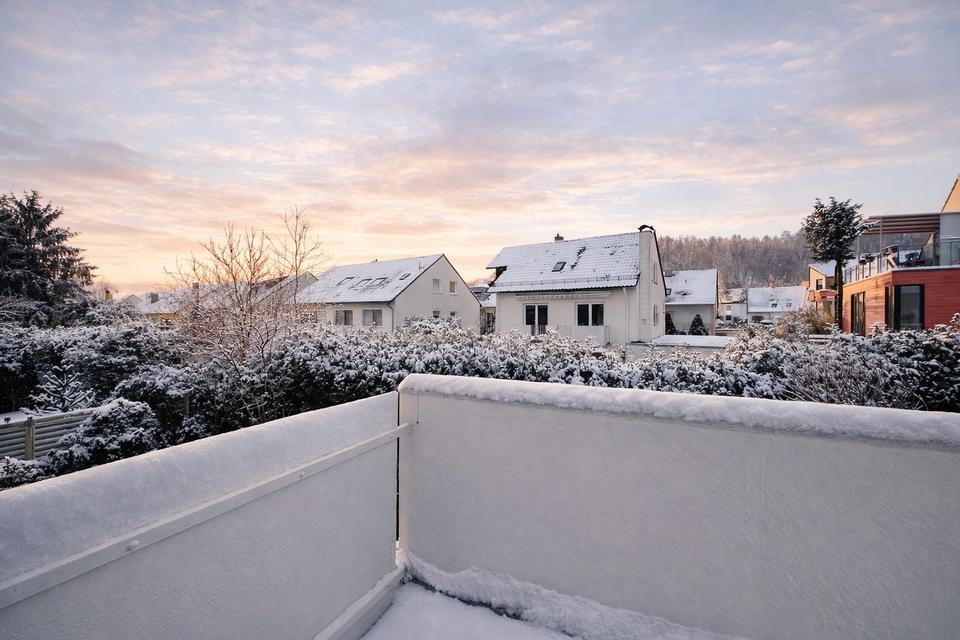 Im Erdgeschoss öffnet sich der helle Wohn- und Essbereich (ca. 34 m²) mit großen Fenstern und direktem Zugang zur Südterrasse. Diese wurde mit einer hochwertigen Kebony – Holzterrasse ausgestattet und durch eine elektrische Markise über die gesamte Breite ergänzt – perfekt für sonnige Tage oder gemütliche Abende im Freien.