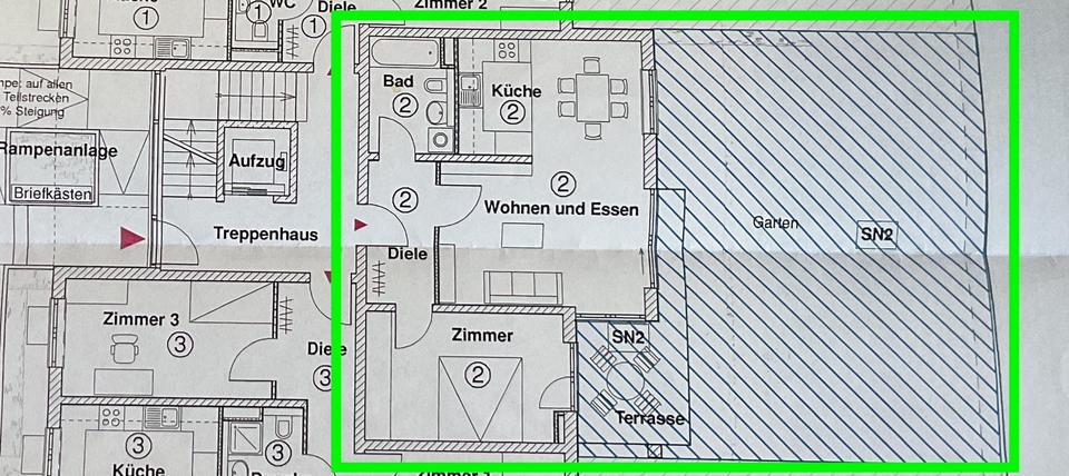 Zum Verkauf stehen die Wohnung, der Keller und der Tiefgargenplatz, sowie das Sondernutzungsrecht für den Garten als zusammenhängende Einheit.