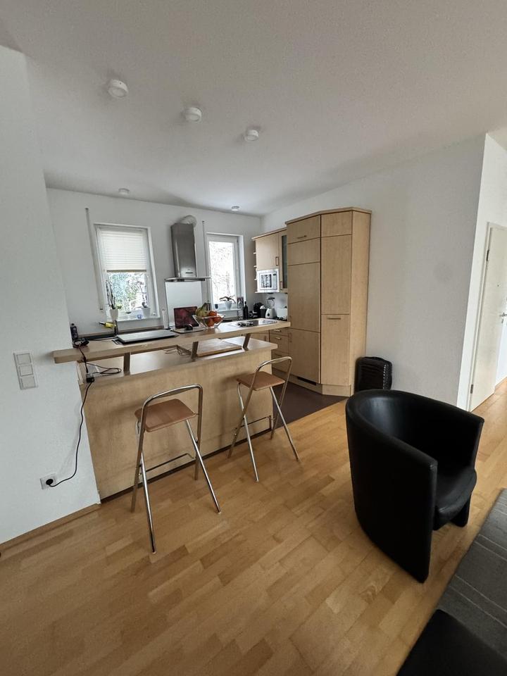 Der Wintergarten, die Küche sowie die beiden Badezimmer sind mit pflegeleichten Fliesen versehen und fügen sich harmonisch in das Gesamtbild der Wohnung ein. Die Einbauküche in hellem Holz ist funktional gestaltet und verfügt über einen Tresen, der sich ideal als Frühstücksplatz oder für informelle Mahlzeiten eignet und den offenen Wohncharakter zusätzlich unterstreicht.