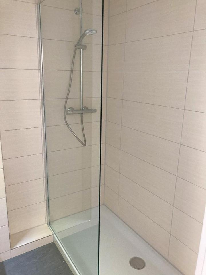 Im Bad befindet sich eine große Dusche und ein Waschbecken. Das WC ist separat.