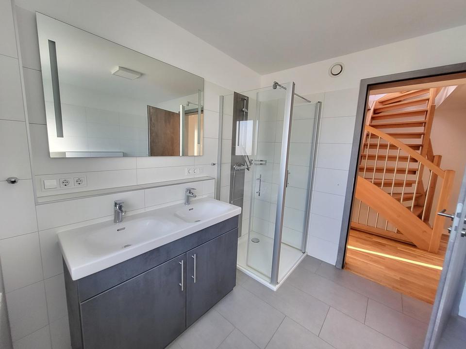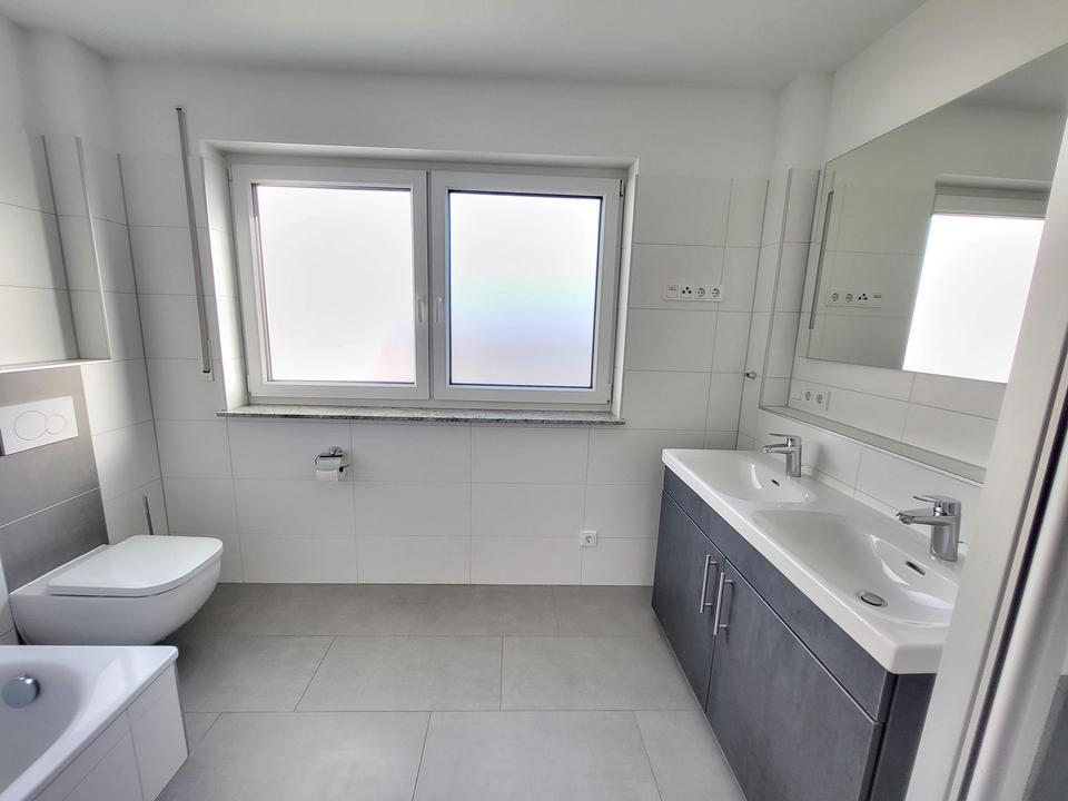 – Bad mit Wanne, Dusche, Doppelwaschtisch und Fenster, türhoch gefliest