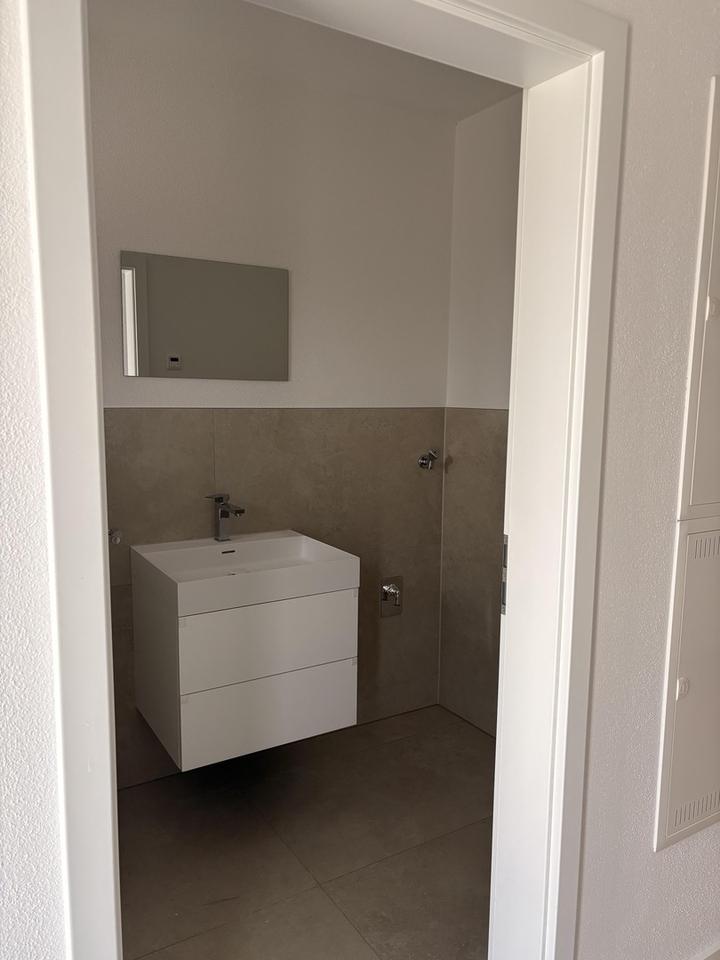 Die Wohnung ist mit bereits installierten Deckenlampen ausgestattet. Das Badezimmer verfügt über moderne WC-Schränke inklusive Spiegel. Zudem ist eine gepflegte Einbauküche vorhanden, die dem Mieter zur Nutzung zur Verfügung steht.