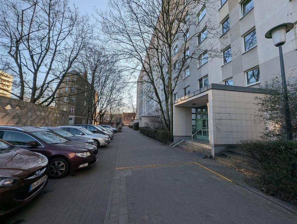 Der Aufgang Nr. 4 kann mit dem Auto über eine parallel zum Baukörper verlaufende Privatstraße erreicht werden. An dieser Straße stehen für die jeweiligen Eigentümer oder Mieter Stellplätze zur exklusiven Nutzung zur Verfügung. Direkt neben dem Hauseingang befindet sich ebenfalls ein Fahrradabstellplatz. Die Hausgemeinschaft ist angenehm und besteht zum Großteil aus Eigentümern. Aufgrund des effizienten Schnitts der Wohnung wäre diese bei Bedarf auch für zwei Parteien bzw. als Wohngemeinschaft nutzbar.
