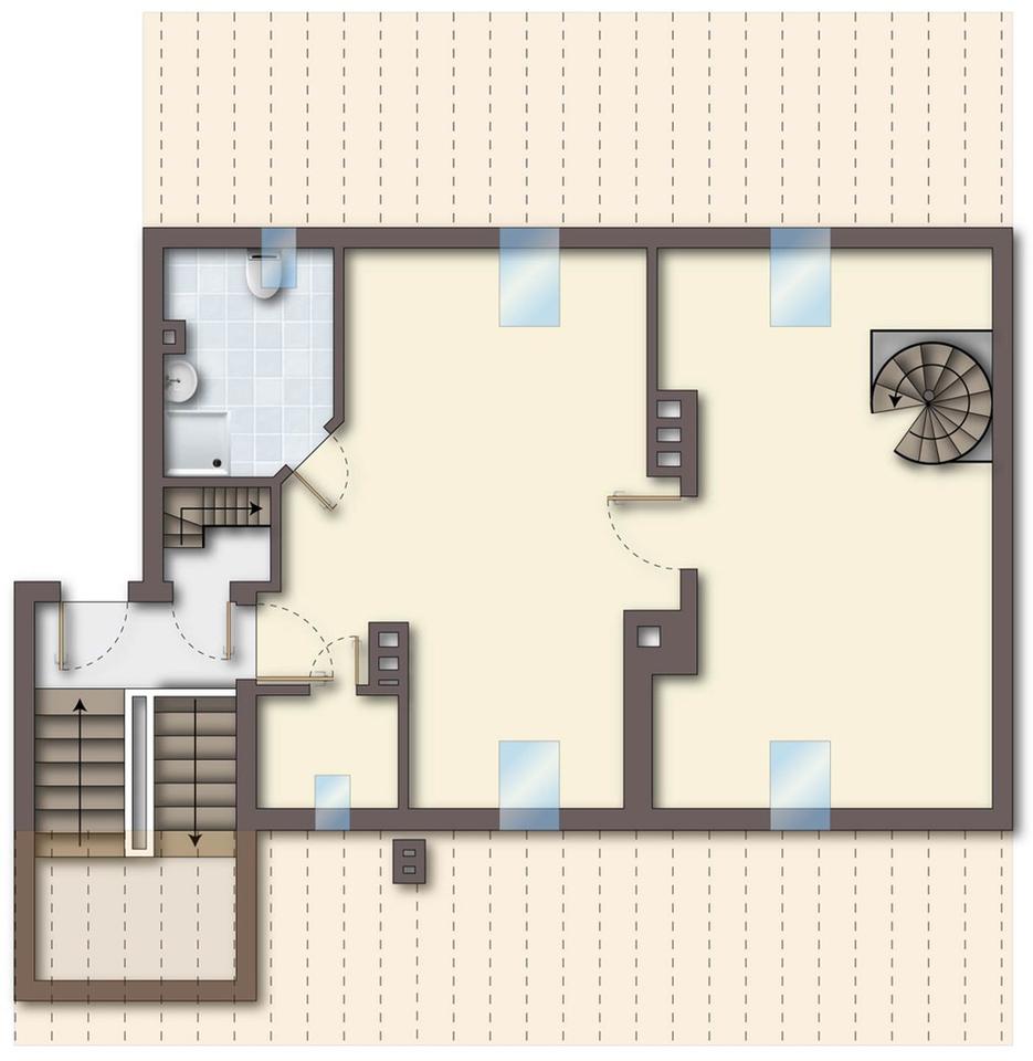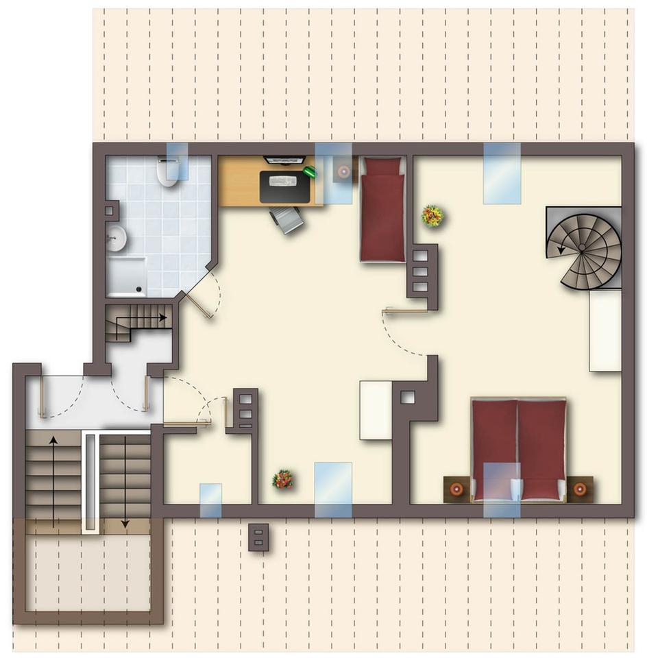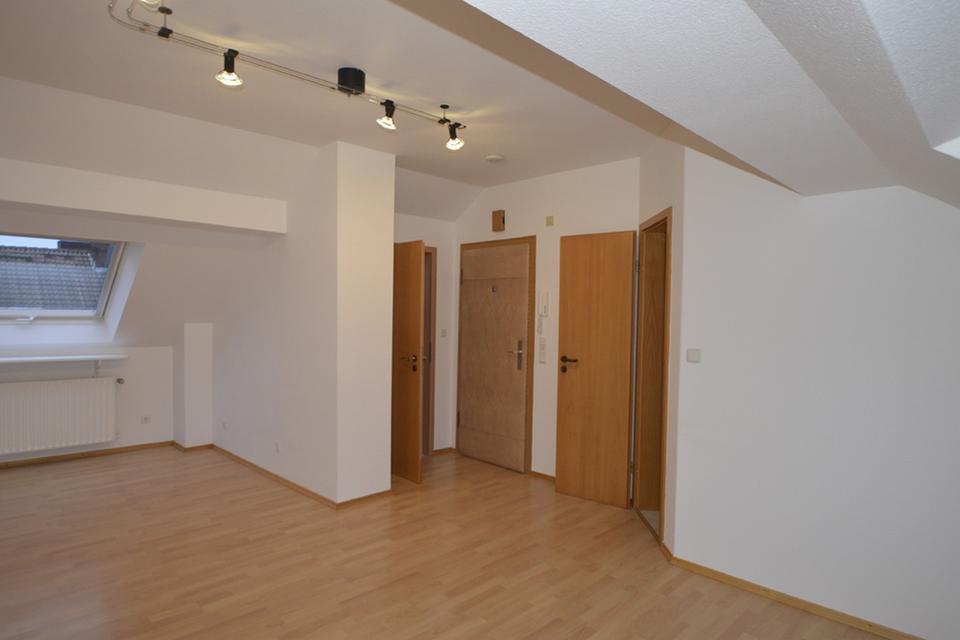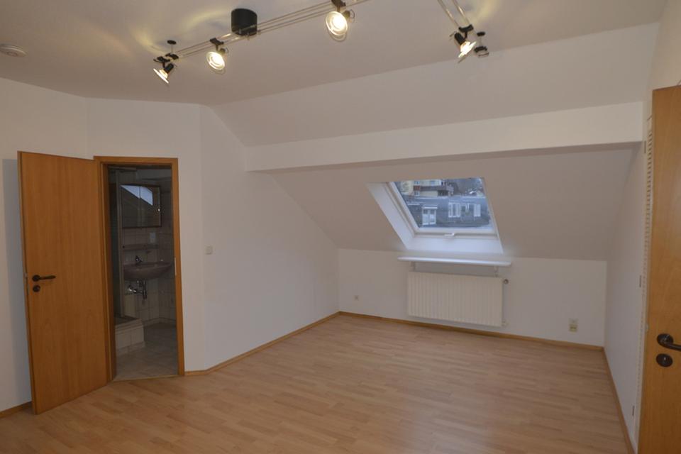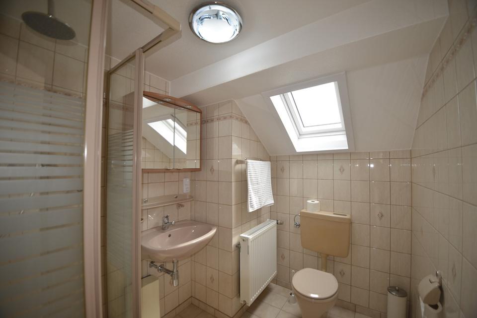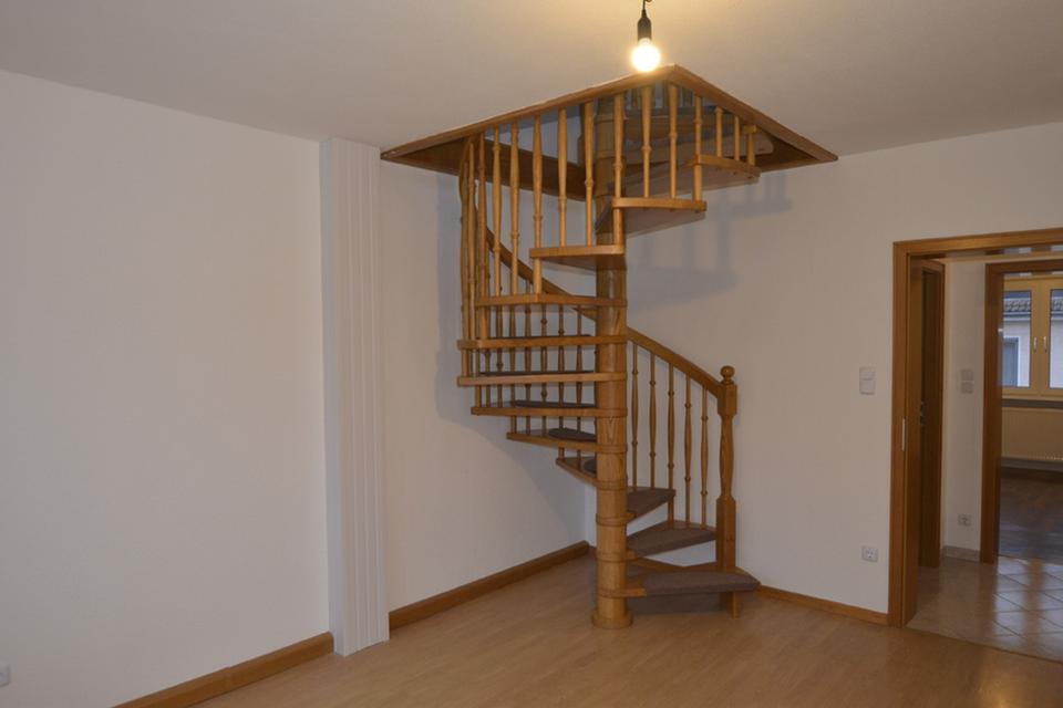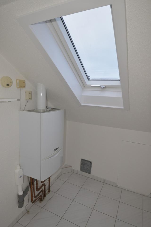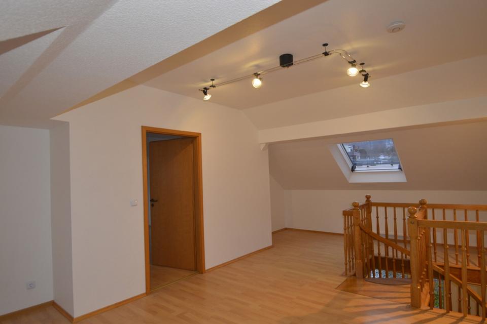 Im hinteren Raum der unteren Ebene führt eine Wendeltreppe in die obere Ebene. Hier finden sich auf ca. 51 m² zwei weitere große Zimmer mit schöner Fernsicht, sowie ein Dusch-Bad (ebenfalls mit Tageslicht) und ein zweiter Abstellraum. Die leichten Dachschrägen machen diese Ebene zu einem gemütlichen Rückzugsort. Velux Dachfenster z.T. mit Solar-Rollladen Funktion bieten hier zusätzlich Schutz für ein ideales Raumklima zu jeder Jahreszeit. Der obere Wohnbereich verfügt über eine separate Wohnungseingangstür und kann somit z.B. als Büro genutzt werden. Die gesamte Wohnung ist frisch renoviert; die Wohnbereiche sind mit pflegeleichten Hartböden (Laminat und Parkett) ausgestattet.