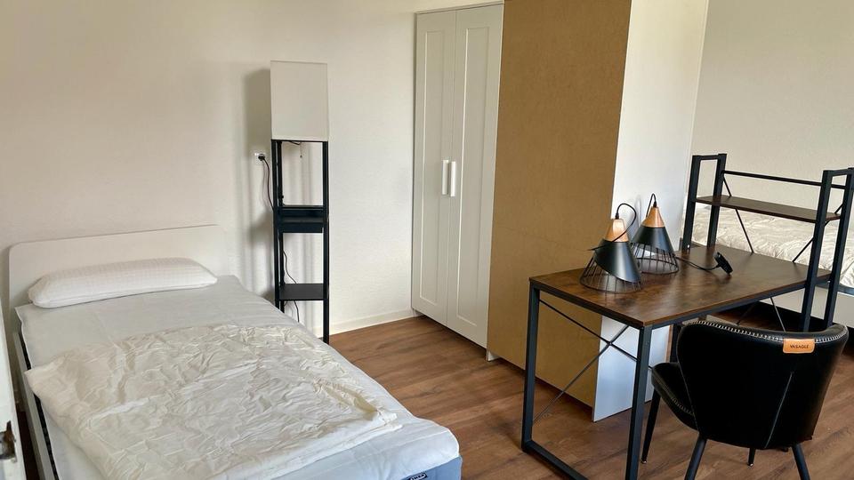 In den 4 Schlafräumen sind jeweils vorhanden: Bett, Schreibtisch & Stuhl, Schrank, Regal, Stehlampe mit USB-Hub