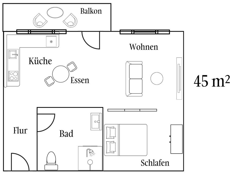 Wir bieten verschiedene Größen zwischen 41 m² und 46 m² an – ideal für Singles oder Paare, die zentral wohnen möchten.