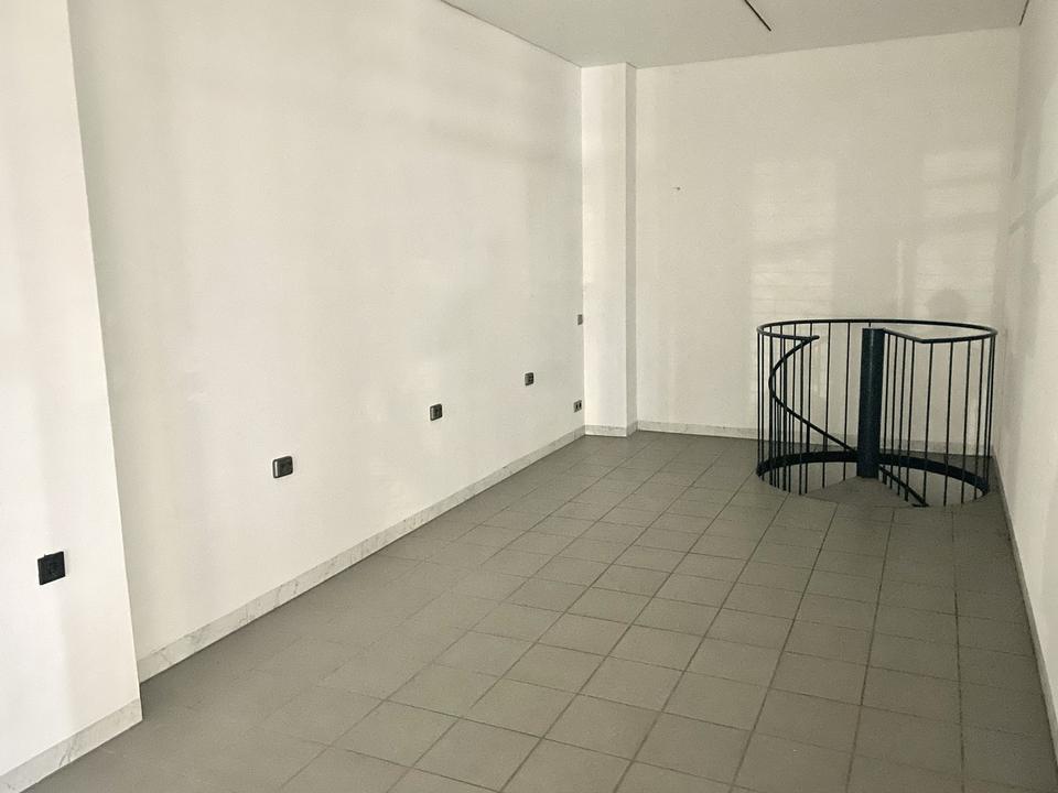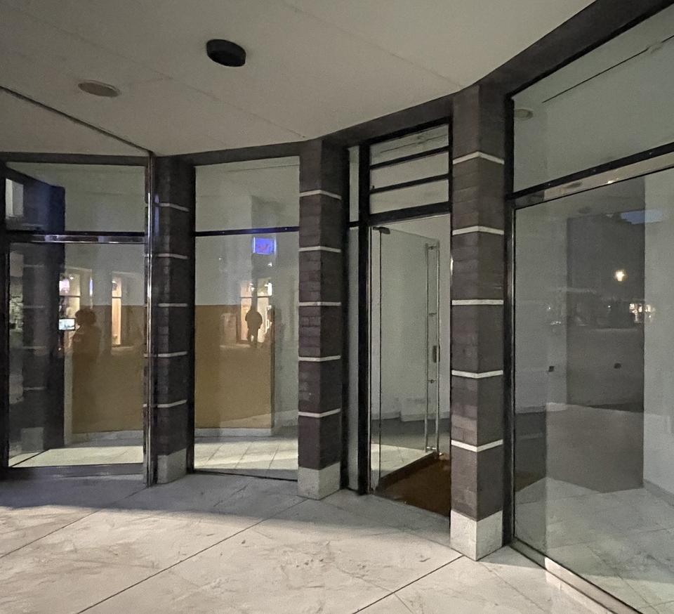 Entlang der geschwungenen und großzügigen Fensterfront können Sie perfekt Ihre Waren präsentieren. Der Eingangsbereich ist innen und außen mit hellem Marmor ausgelegt. Die Fensterrahmen sind aus hochwertigem Aluminium und poliertem Edelstahl gefertigt und die Eingangstür besteht aus Ganzglas.
