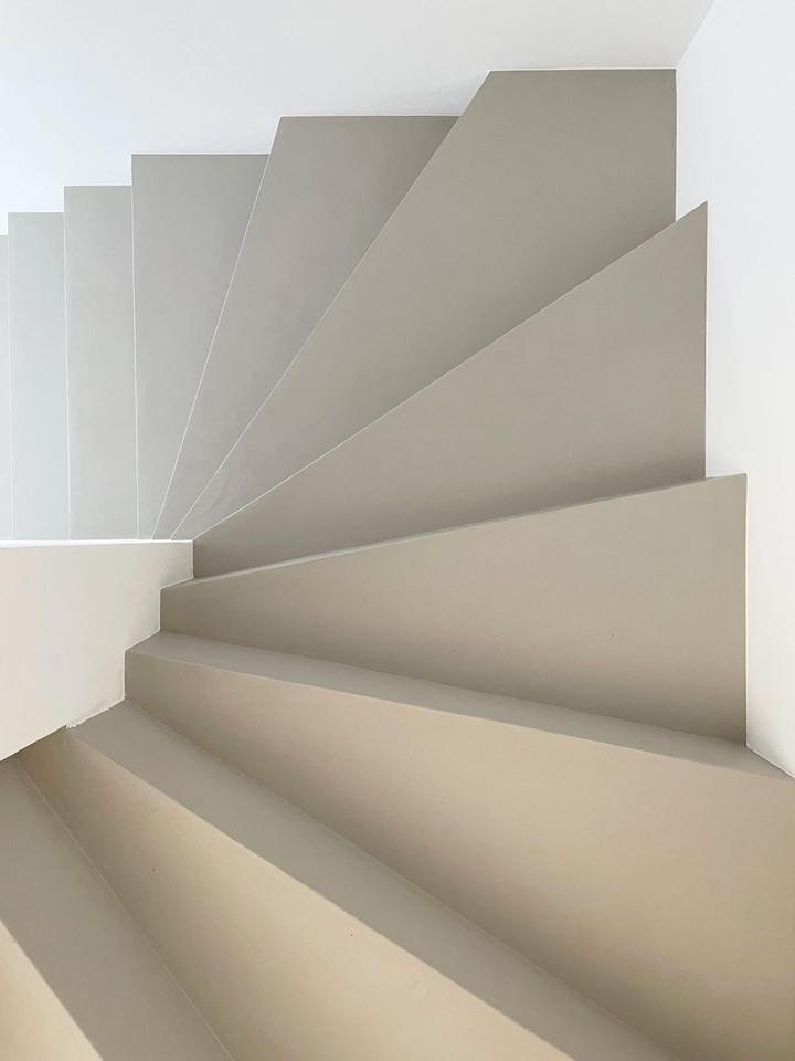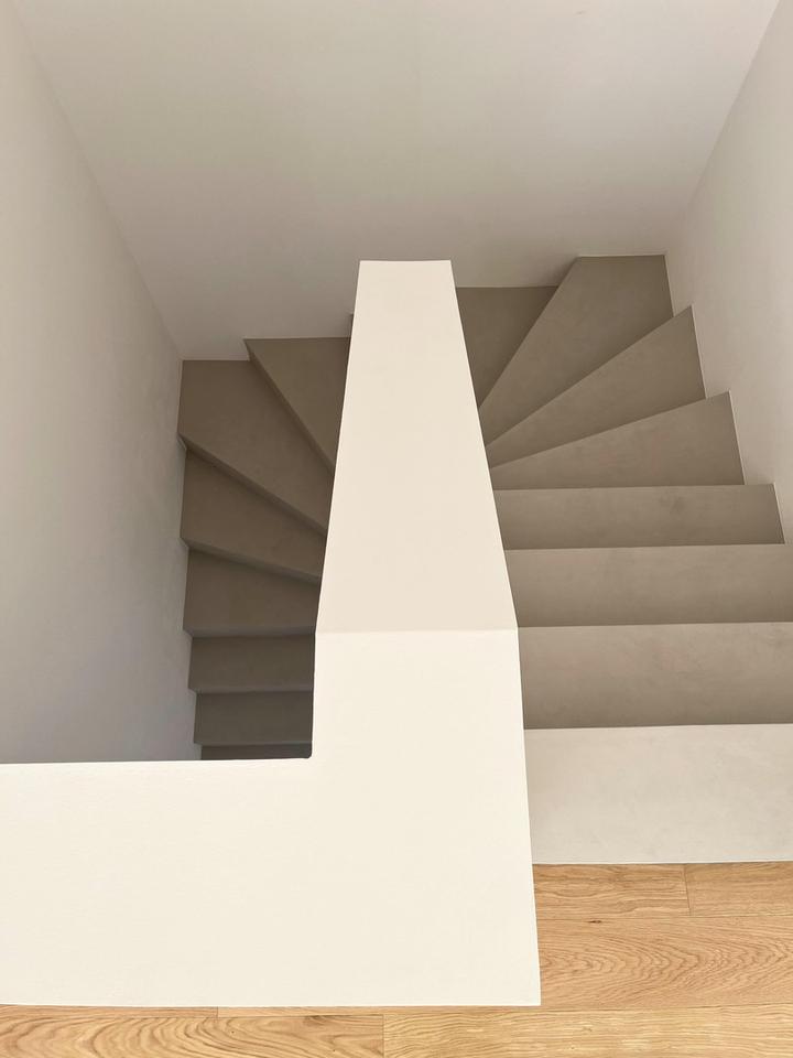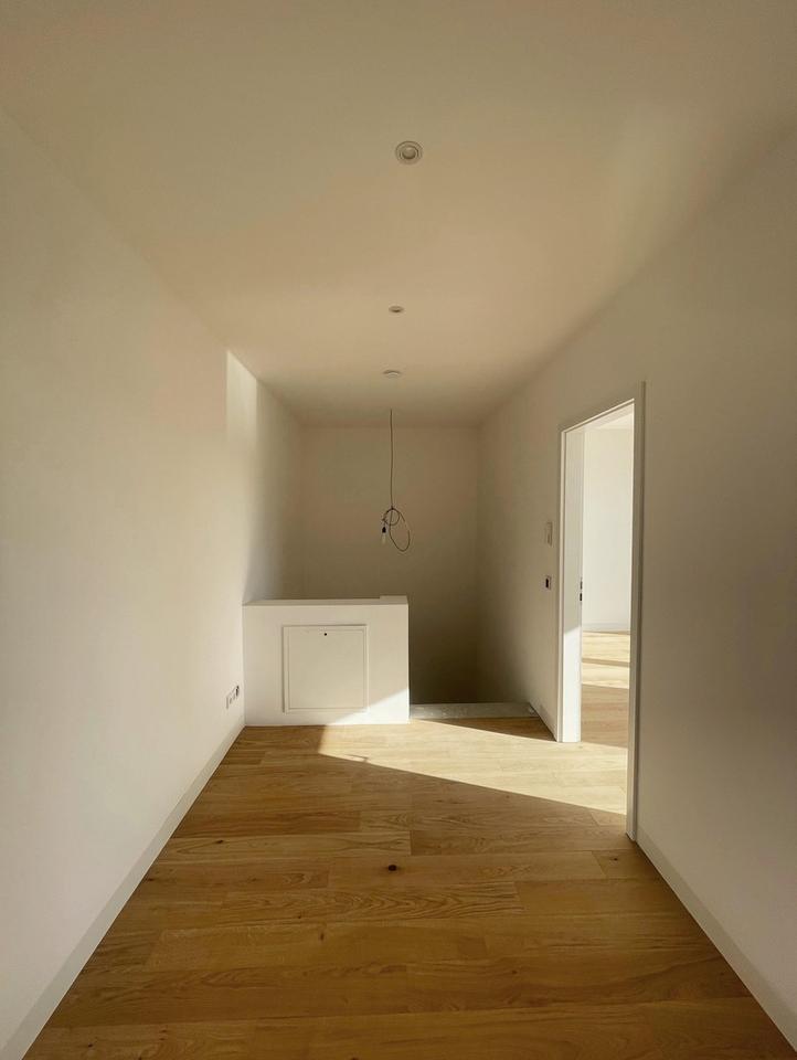 Eine moderne Betontreppe führt in das Obergeschoss. Hier werden Sie von einem großzügigen Flur mit genügend Freiraum für einen Home-Office-Platz empfangen. Dieser verzweigt direkt in zwei Kinderzimmer/Büros mit Blick in den eigenen Garten. Das geräumige Haupt-Bad verfügt bereits über einen Waschtisch inklusive Unterschrank sowie eine bodengleiche Regen-Dusche und WC.