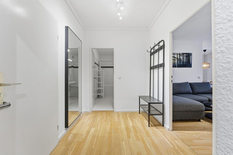 Die Immobilie liegt im 6. Obergeschoss und ist mit dem Aufzug gut und schnell erreichbar. Alle drei Zimmer gehen vom Flur ab, welcher über genug Stauraum für diverses verfügt.