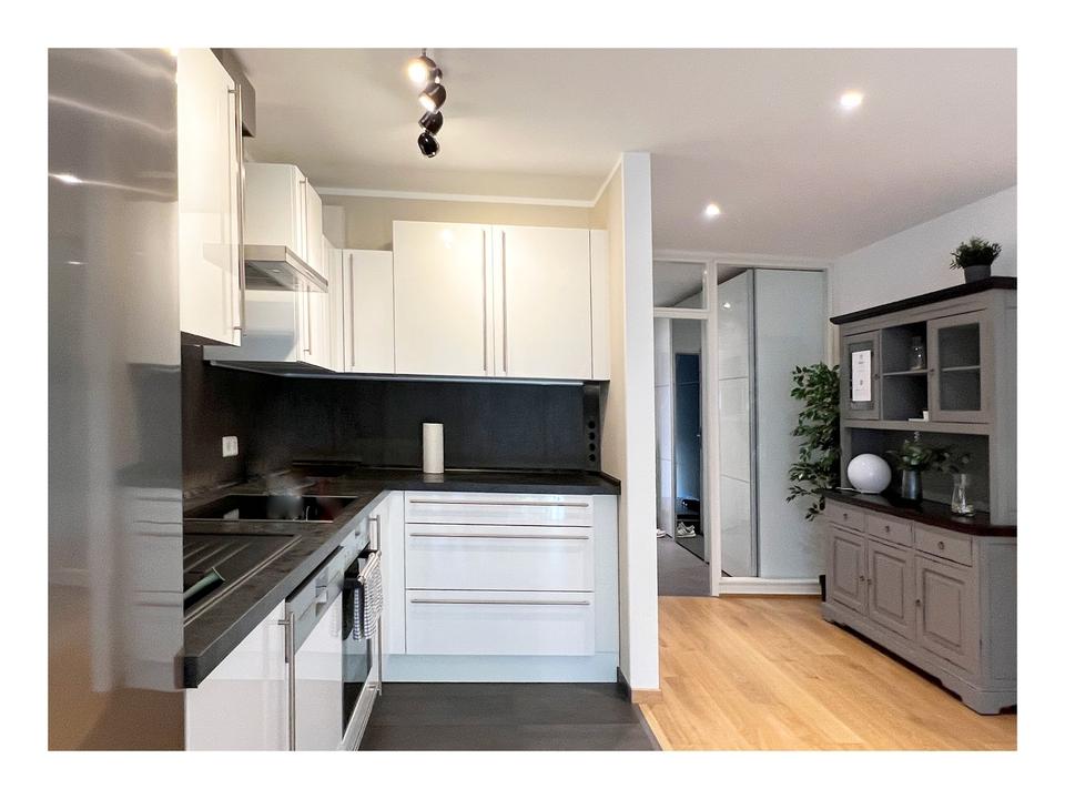 Hochwertige zum Wohnbereich offene Küche, Dunstabzug, elektrischer Backofen, Induktionskochfeld, Kühl- Gefrierkombination, Spülmaschine, Kapsel-Kaffeemaschine, Wasserkocher, komplett mit Geschirr und Küchenutensilien.