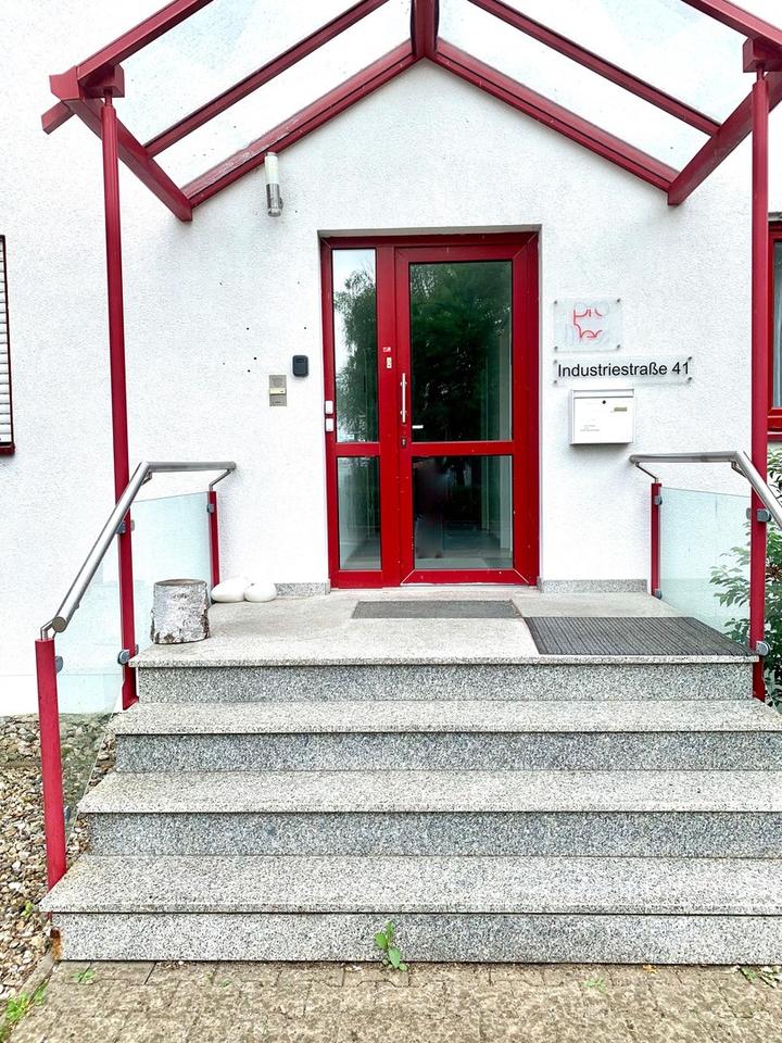 Der Zugang erfolgt über den Haupteingang mit einer vierstufigen Treppe; ein barrierefreier Zugang kann bei Bedarf nachträglich angebaut werden. Fünf Stellplätze direkt vor dem Eingang bieten komfortables Parken für Mitarbeitende und Besucher.