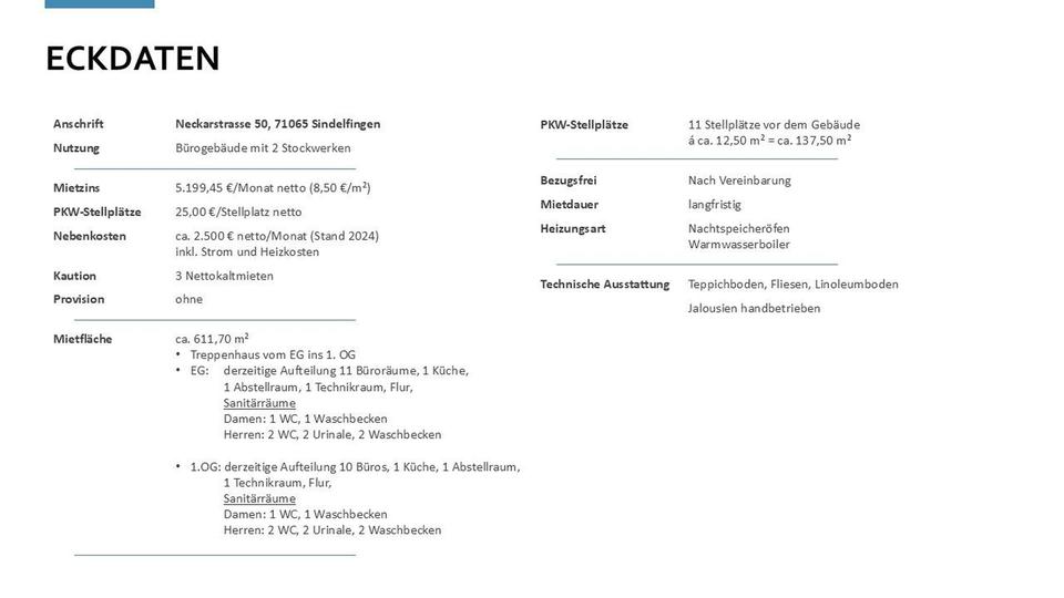 Das Mietobjekt zeichnet sich durch eine attraktive zentrale Lage, die exklusive Alleinnutzung sowie durch die unmittelbar am Gebäude verfügbaren Parkmöglichkeiten aus. Über ein großzügiges Treppenhaus mit breiter Treppe gelangen Sie in das 2-geschossige Gebäude. Sowohl im EG wie auch im 1. OG erreichen Sie alle Räume über einen langen gut beleuchteten Flur. Die derzeitige Aufteilung der beiden Geschosse sind 10-11 Büros/Besprechungsräume, jeweils eine Küche, eine Abstellkammer, einem Technikraum und Sanitärräumen.
