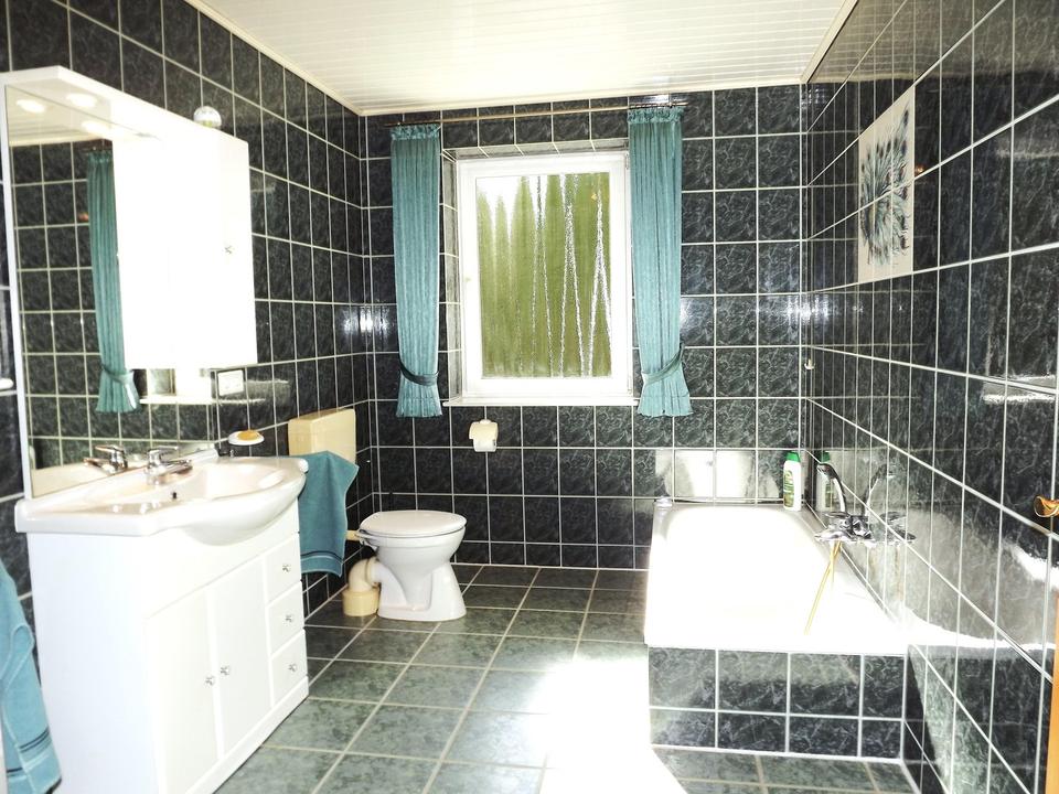 Vollbad mit Badewanne, Dusche, Waschtisch-Badblock, und WC.