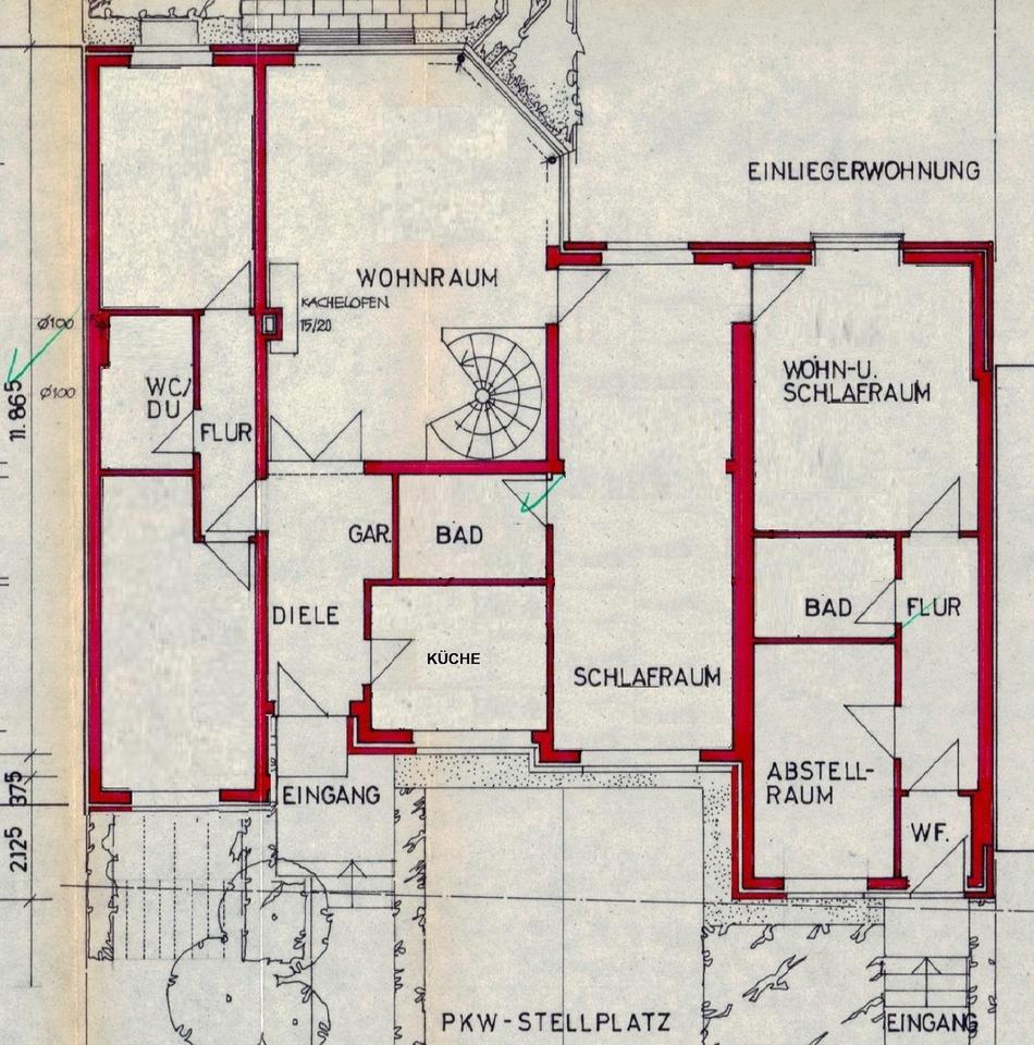 Die Einliegerwohnung verfügt über einen separat eigenen Eingang. Zu den Räumlichkeiten gehören ein Flur, eine Küche, ein Badezimmer sowie ein Wohn – Schlafzimmer. In den neunziger Jahren wurde ein Durchbruch von der Hauptwohnung zu der Einliegerwohnung erstellt, so dass diese beiden Einheiten miteinander verbunden sind. Auf den Grundrissplänen sehen Sie eine Variante mit – und eine Variante ohne Verbindung der beiden Wohneinheiten.