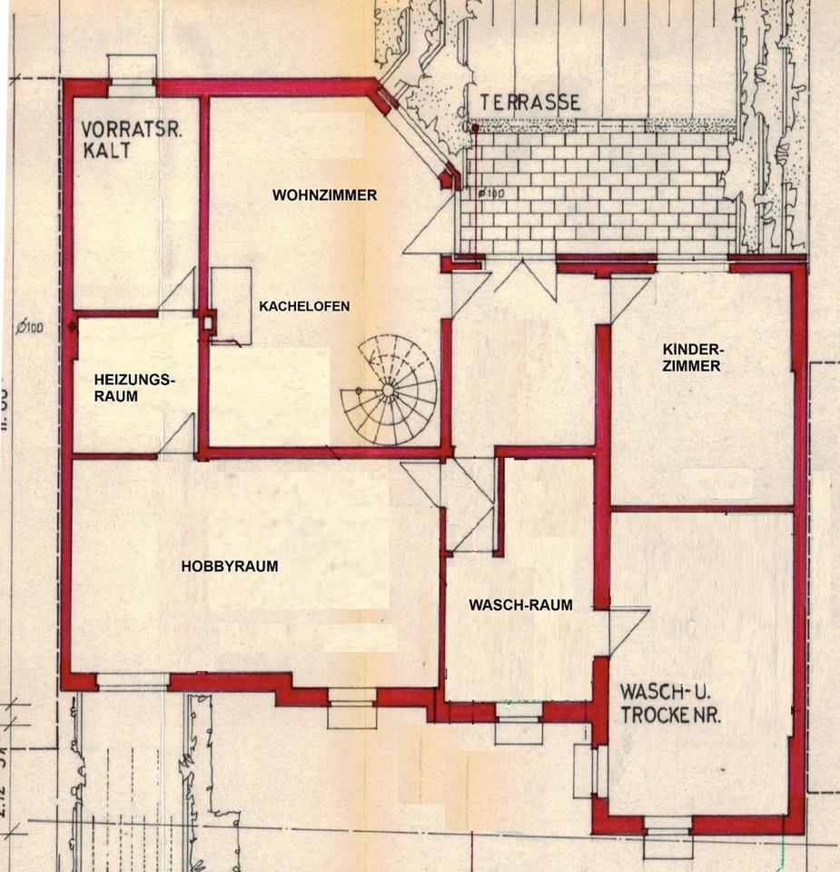 Zu der Hauptwohnung gehören im Erdgeschoss ein heller Eingangsbereich, das Wohnzimmer mit Kachelofen und Zugang zum Garten, drei Schlafzimmer, zwei Bäder sowie die Küche. Das große Badezimmer wurde vor wenigen Jahren modernisiert und verfügt über eine bodengleiche Dusche. Über eine Wendeltreppe gelangt man in das Souterrain. Das 2. Wohnzimmer verfügt ebenfalls über einen Kachelofen sowie über direkten Zugang zu einer weiteren Terrasse. Zudem befindet sich im Souterrain das 3. Kinderzimmer. Der Kellerbereich verfügt über 5 Räume, hierunter über einen ca. 33 m² großen Hobbyraum sowie über einen Saunaraum.