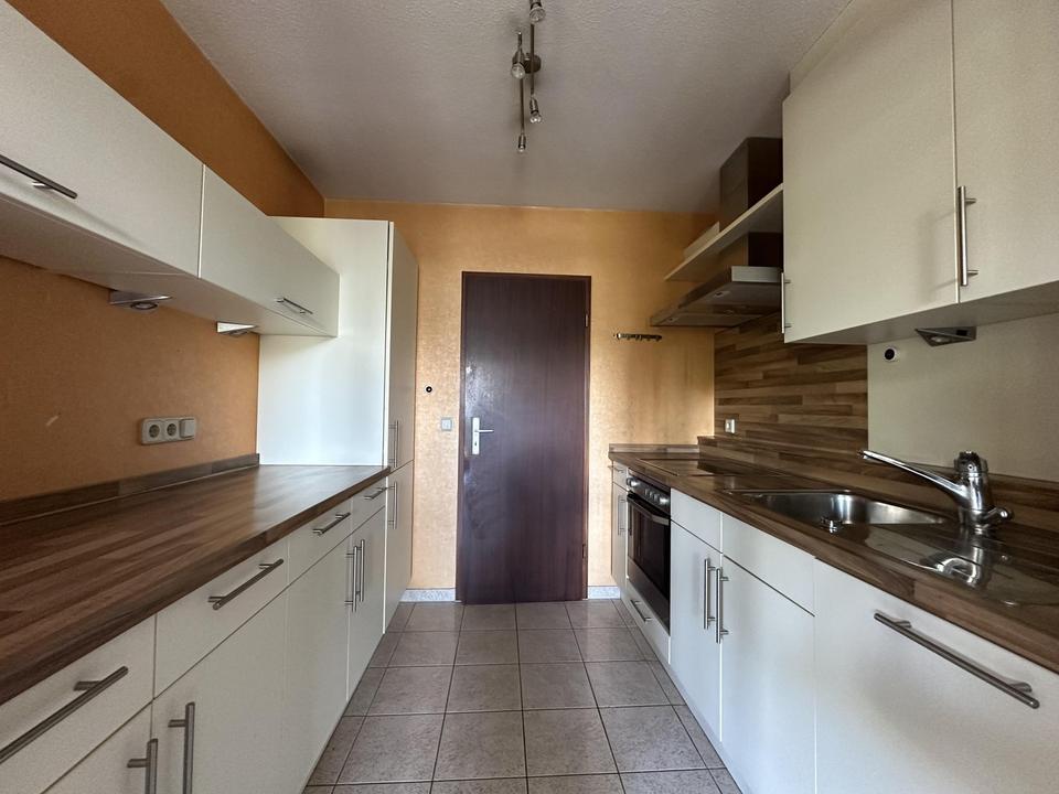 Die Einbauküche ist funktional und ästhetisch ansprechend gestaltet. Mit einer Schiebetür vom Wohn-Essbereich abgetrennt, lädt sie zum Kochen und Verweilen ein.