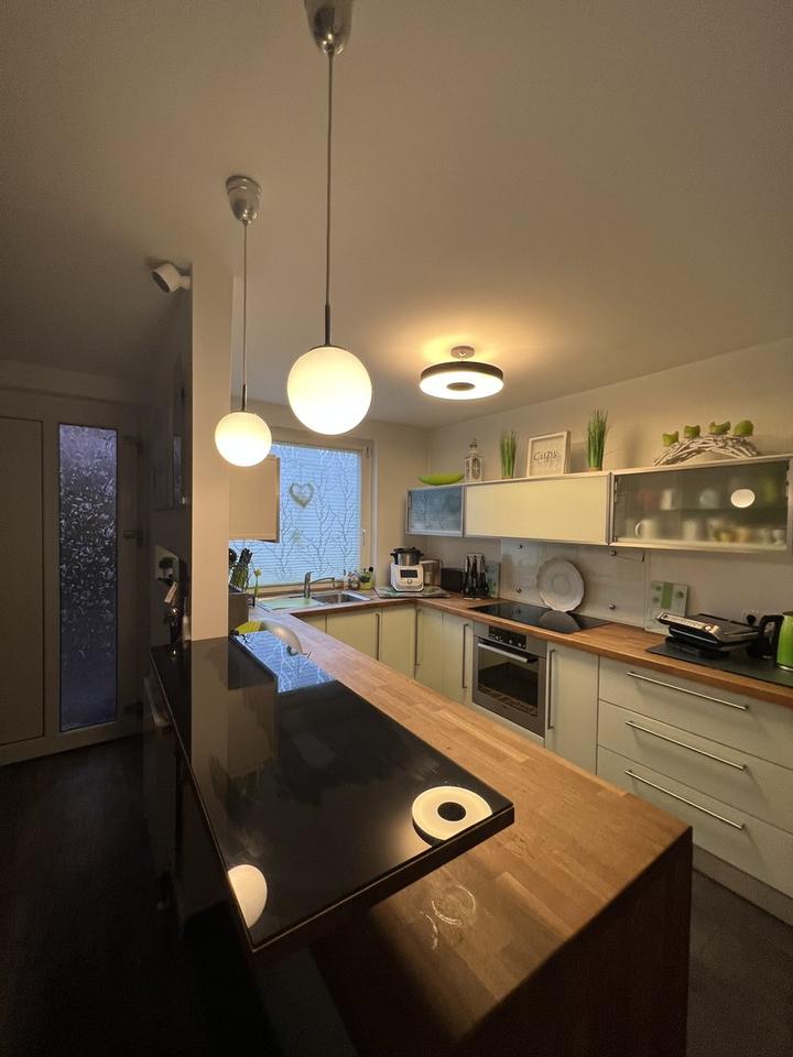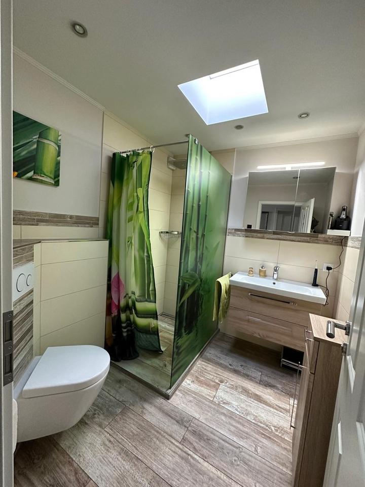 Die angrenzende Küche ist modern ausgestattet und lässt keine Wünsche offen: Induktionskochfeld, Geschirrspüler sowie ein Side-by-Side-Kühlschrank mit Direktwasseranschluss sorgen für zeitgemäßen Komfort. Das stilvoll gestaltete Duschbad mit Velux-Deckenluke bringt zusätzliches Tageslicht und rundet das Raumangebot auf dieser Ebene ab.