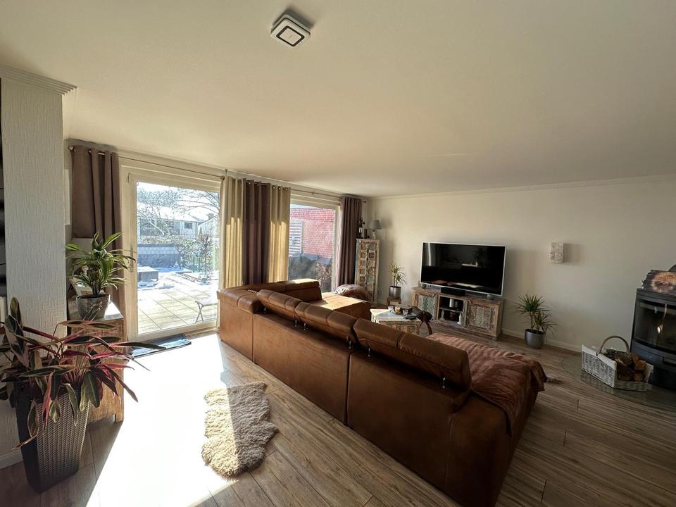 Auf rund 100 m² Wohnfläche verteilen sich vier helle, gut geschnittene Zimmer, die flexibel als Schlaf-, Arbeits- oder Hobbyräume genutzt werden können. Herzstück des Hauses ist der großzügige Wohn- und Essbereich mit Kamin und direktem Zugang zur Terrasse – ein Ort, der zu gemütlichen Abenden und geselligen Stunden einlädt.