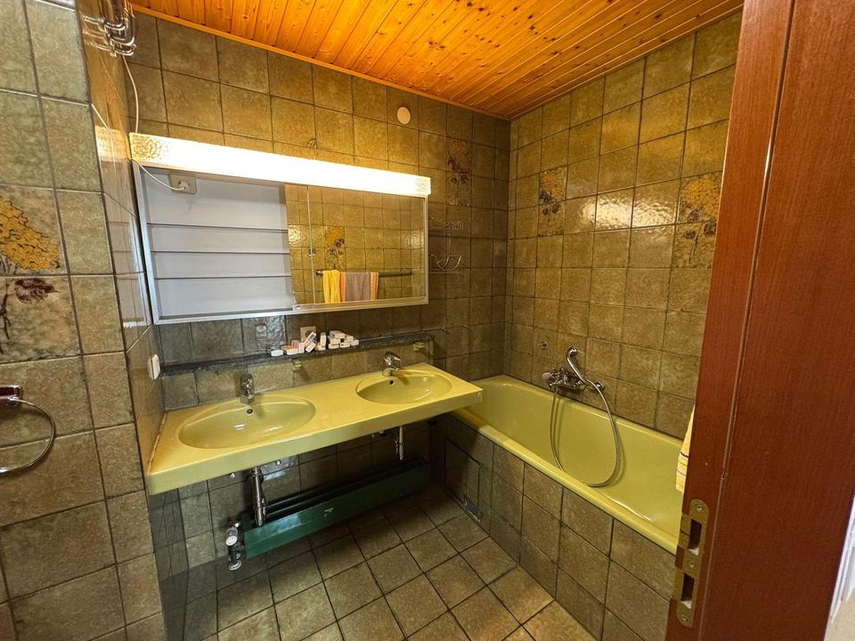Das lichtdurchflutete Badezimmer schafft eine freundliche Atmosphäre und lädt zum Wohlfühlen ein. Mit Dusche, Badewanne, Waschbecken und WC ausgestattet, bietet es großzügigen Platz für die ganze Familie.