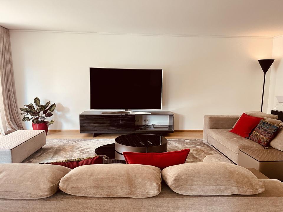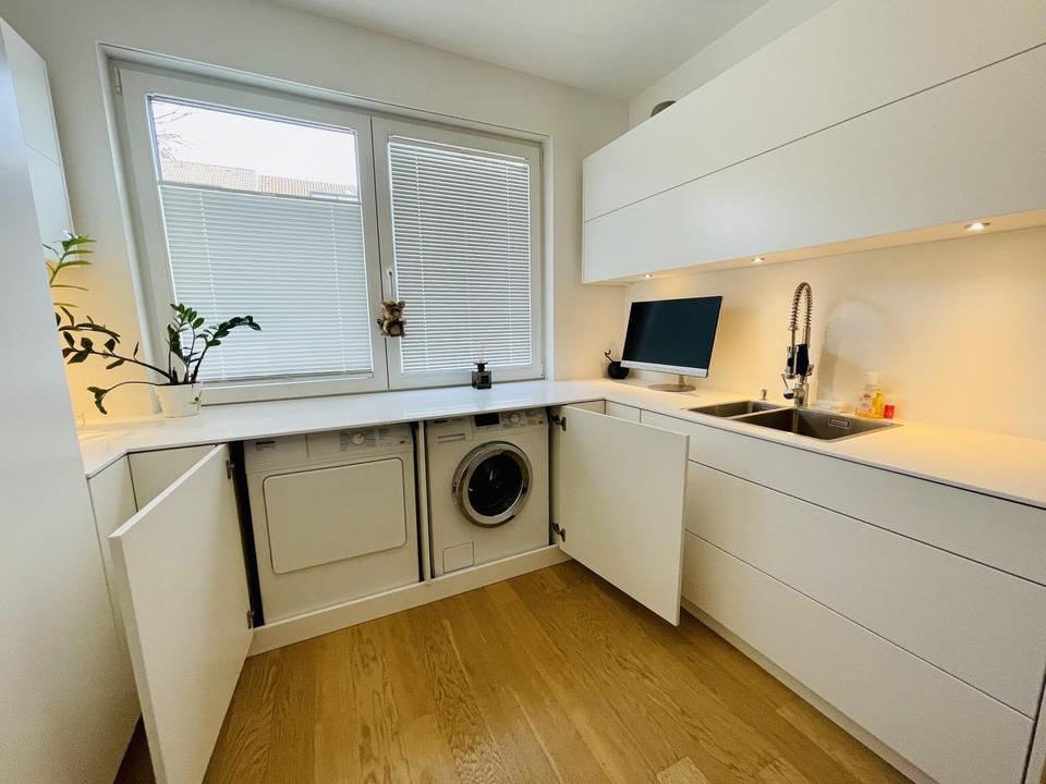 Der repräsentative Wohnbereich mit Kaminzimmer und einer modernen Designerküche von Poggenpohl (Porsche Design) ist funktional und zugleich elegant gestaltet. Großzügige, bodentiefe Fensterfronten öffnen den Raum zur sonnigen Süd-West-Terrasse. Ergänzt wird diese Ebene durch eine großzügige Eingangsdiele mit Garderobe, ein Gäste-WC sowie einen praktischen Wirtschaftsraum/ Anschlussraum.