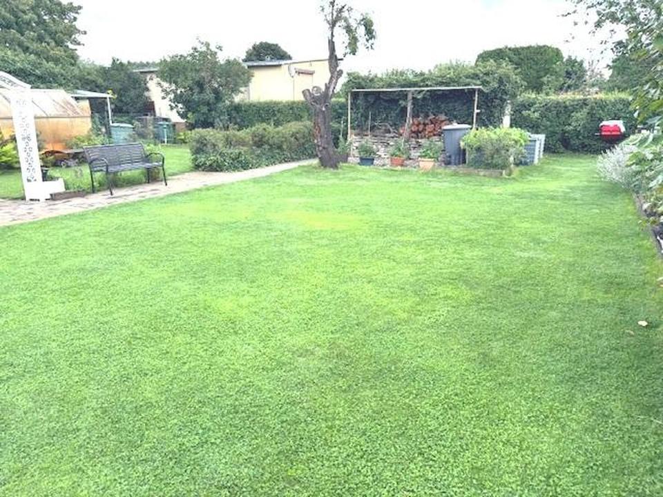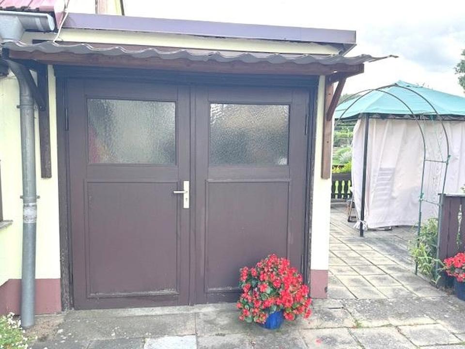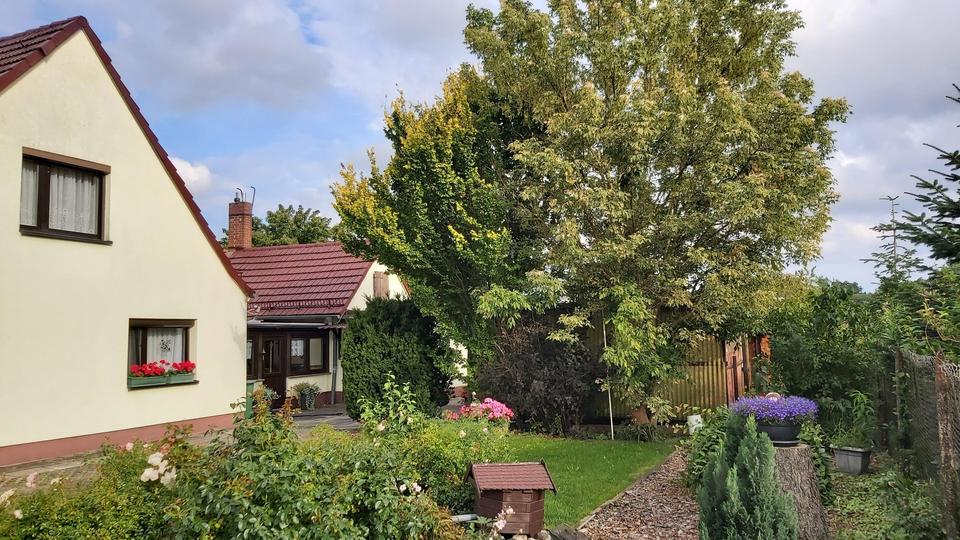 Das Haus hat 2 Etagen und empfängt Sie und Ihre Gäste in einer wohnlichen Veranda. Im Erdgeschoss befinden sich zwei Wohnräume, Duschbad, Küche mit Essbereich, Gastherme und angegliedertem Vorratskeller mit Wasser- und Abwasseranschluss. Im Obergeschoss steht Ihnen ein weiterer sonnendurchfluteter Wohnraum, sowie eine kleines Zimmer zur Verfügung, welches momentan als Nähzimmer dient. Die doppelverglasten Kunststofffenster sind mit Rollläden ausgestattet. Ein hübscher kleiner Teich im Vorgarten, umrandet von einer prächtigen Rosenrabatte, ziehen die Blicke von Spaziergängern auf sich. Ein großes Carport und eine Garage, die als Werkstatt genutzt wird und die Brunnenpumpe zur kostengünstigen Gartenbewässerung beherbergt, schließen sich an. Im hinteren Teil des Grundstücks befand sich früher der Nutzgarten, sogar auf dem Trockenplatz wurden Kartoffeln angebaut. Später entstanden hier Grünflächen, und ein Pool und eine Tischtennisplatte wurden aufgestellt. Jetzt kümmert sich Robby, der Rasenroboter, um die große Rasenfläche. Nebengelass und überdachte Flächen sind in die Jahre gekommen und mit geringem Aufwand schnell entfernt. Hier können Sie Ihrer Phantasie freien Lauf lassen und Ihr Grundstück nach Ihren Wünschen gestalten bzw. nutzen.