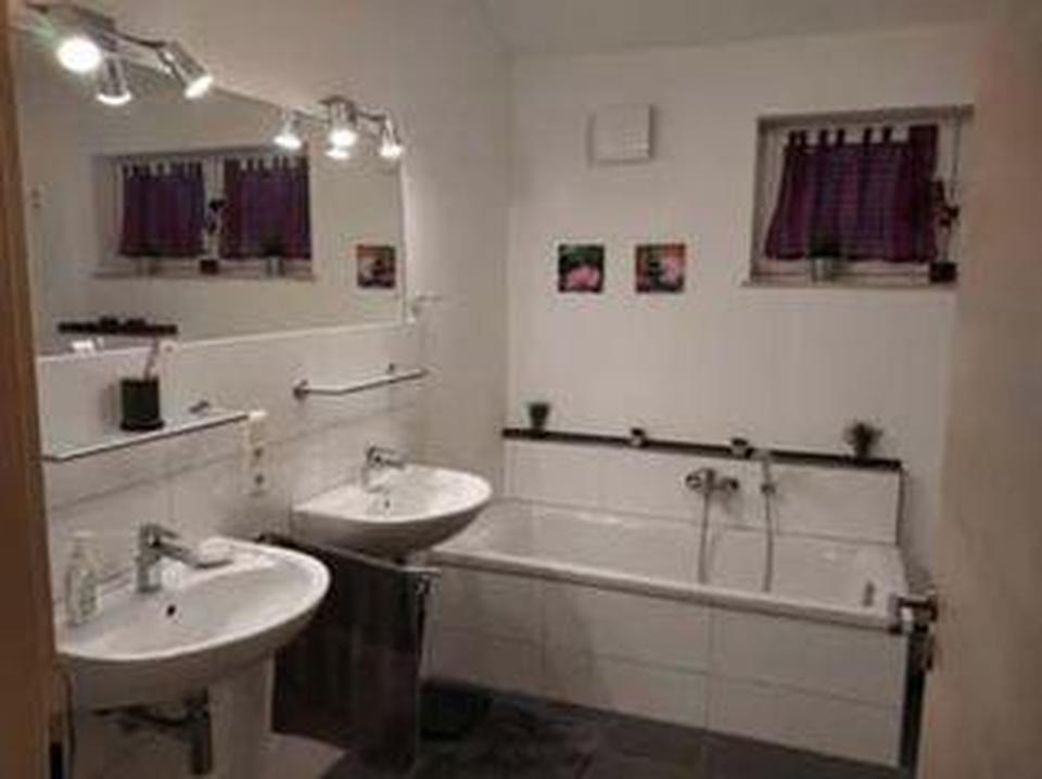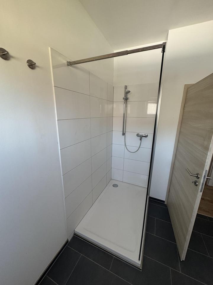 Das gemütliche Bad hat eine große bodenebene Dusche mit Glasabtrennung, Badewanne, zwei Waschtische sowie WC. Zusätzlicher Stauraum findet sich im ausgebauten Dachboden, der über eine Zugtreppe im Flur erreichbar ist.