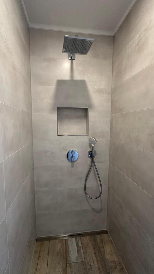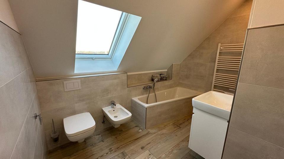 – ebenerdige Dusche mit Duschrinne, Bidet und Badewanne