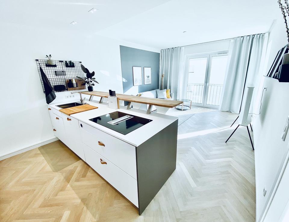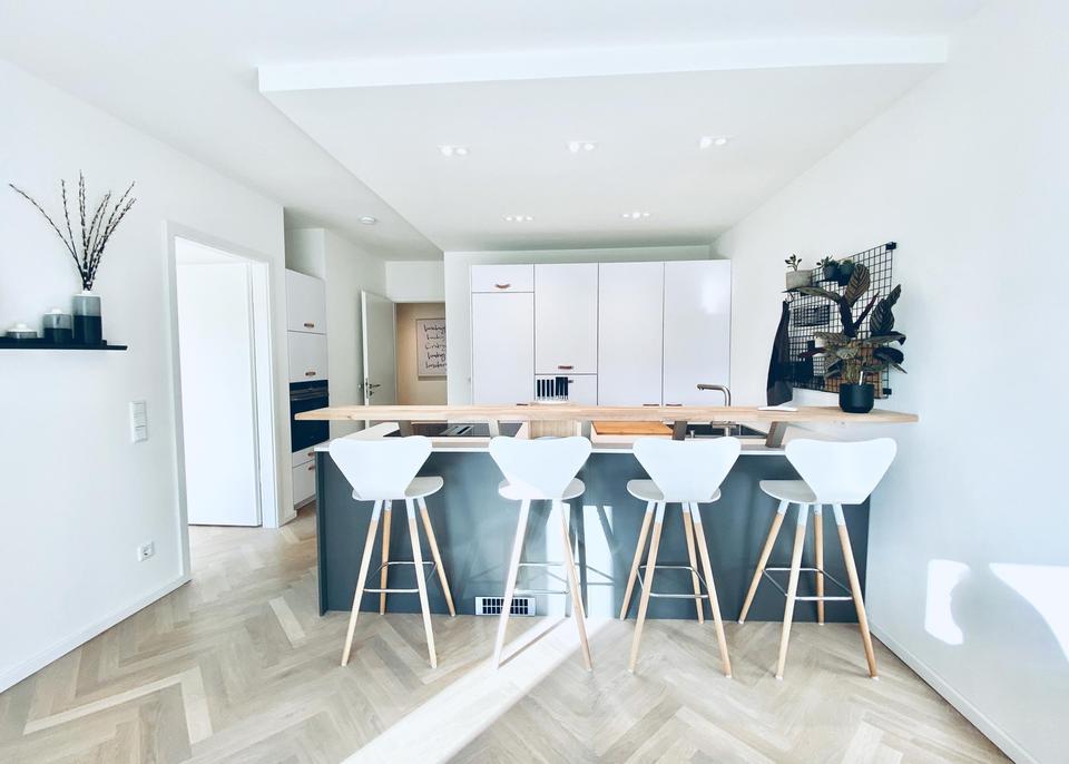 Die offene Wohnküche ist mit einer modernen Design Einbauküche inkl. sämtlicher Elektrogeräte ausgestattet. Durch das abgestimmte Design der Farben mit weißen Fronten und einer zeitlosen Arbeitsplatte fügt sich die Wohnküche harmonisch in Ihren individuellen Wohnstil ein. Die Einbauküche bietet außerordentlich viel Stauraum, welcher u.a. durch einen Vorratsschrank mit Innenauszügen, einen Haushaltsschrank sowie viele Schubladen geschaffen wird. Zudem sorgen die auf Arbeitshöhe eingebaute Geschirrspülmaschine und der Backofen für ein rückenfreundliches Arbeiten. Die Wandnische mit integriertem Hochschrank fügt sich harmonisch in das Gesamtbild ein. Außerdem gewährleistet das Induktionskochfeld mit integriertem Wrasenabzug (Downlüfter) eine komplett freie Sicht in das Wohnzimmer (ohne störende Abzugshaube). Ein besonderes Highlight ist der über der Küche abgehängte Decken-Quader mit integrierter Spot-Beleuchtung. Auf der Rückseite der Küchenzeile entsteht durch die überstehende Arbeitsplatte ein kommunikativer Essplatz, welcher Küche und Wohnzimmer verbindet und das Kochen zum Event macht.