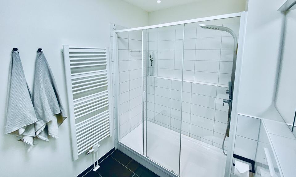 Lassen Sie sich vom stilvollen Bad mit großformatigen, anthraziten Bodenfliesen und weißen Wandfliesen begeistern. Es überzeugen zudem eine XXL Dusche mit einem Edelstahl Duschpaneel inkl. Massagedüsen, moderne Armaturen sowie ein Handtuchheizkörper und weitere namhafte Sanitärobjekte.