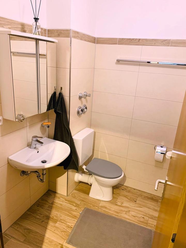 Einbauküche und ein modernes Badezimmer mit Duschbadewanne. Darüber hinaus sind sowohl ein privates
