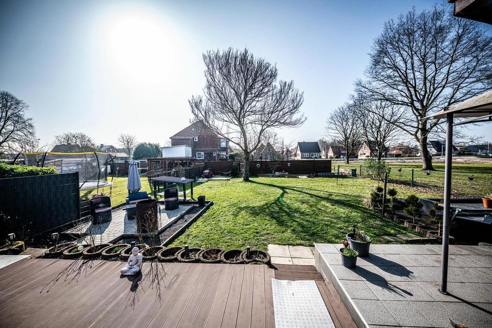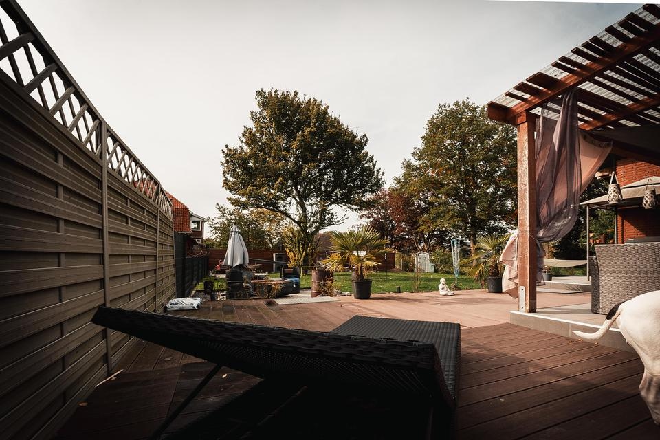Die westlich ausgerichtete Terrasse bietet einen freien Blick in den großen Garten mit Grillecke und lädt zu entspannten Stunden im Freien ein. Eine nahezu fertiggestellte Außensauna ist bereits vorhanden, der Einbau des Heizofens steht noch aus.