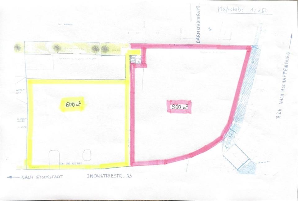 Vermiete ab sofort attraktives, asphaltiertes Gewerbegrundstück in bester Lage, 1400 m² teilbar in 800 m² + 600 m² für – Verkaufsfläche – Autohandel – Stellplatz – an einem stark befahrenen Eckgrundstück an der Bundesstrasse B26 Darmstädterstrasse / Industriestrasse 33 in Stockstadt / Main, vor den Toren Aschaffenburgs.