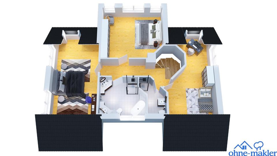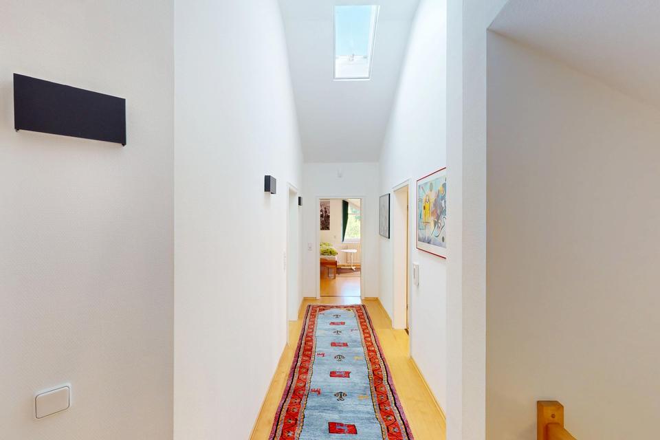 Eine eindrucksvolle achteckig ausgeformte Treppe aus massivem Ahornholz führt ins Obergeschoss, das sich durch hohe Decken und angenehme Lichtverhältnisse auszeichnet. Drei Schlafzimmer bieten ausreichend Rückzugsraum für die ganze Familie. Das Hauptschlafzimmer verfügt über eine Deckenhöhe von bis zu 4,20 m und bietet durch große Fensterflächen einen unverbauten Blick ins Grüne. Optional läßt sich dieses Zimmer auch durch eine Trennwand in zwei Kinderzimmer trennen. Das großzügige Wannenbad ist ebenfalls bis in den Giebel geöffnet und bietet durch die Kombination aus Fußbodenheizung, Wandheizkörper und hochwertigen Armaturen (Dornbracht, Platin-Ausführung) ein modernes, komfortables Raumgefühl. Zusätzlich steht noch ein kleines Duschbad zur Verfügung. Die Fenster im Obergeschoss wurden 2021 am Südwestgiebel mit einer neuen 3-fach-Verglasung ausgestattet.