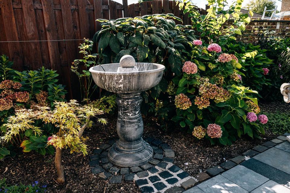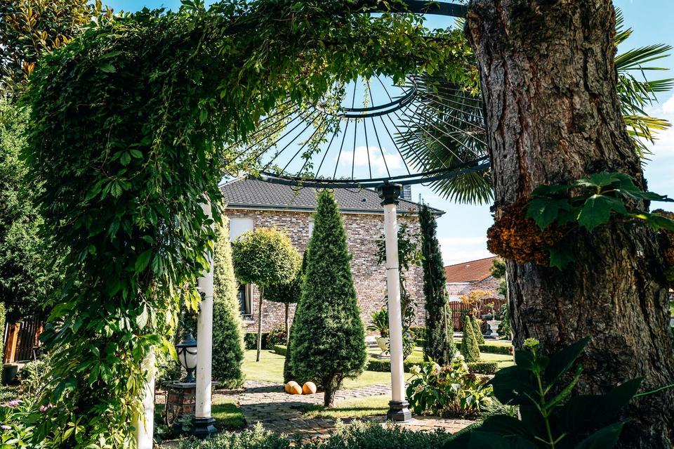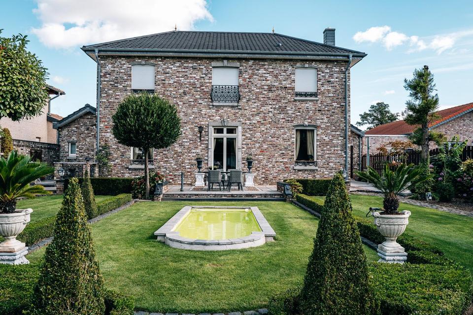 Auch im Garten wurde das historische Gestaltungskonzept harmonisch fortgeführt. Der nach Südwesten ausgerichtete und vollständig eingefriedete Garten besticht durch seine formale Linienführung, kunstvoll geschnittene Gehölze, ein stilvolles Wasserbecken und die gekonnte Integration historischer Bauelemente.