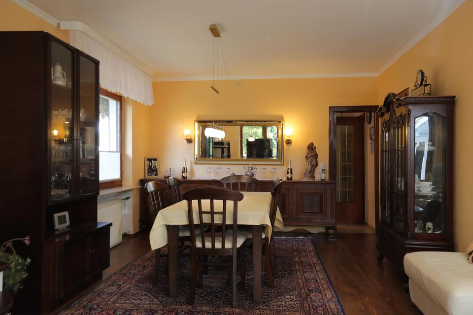 Das Herzstück des Hauses bildet das weitläufige und lichtdurchflutete Wohnzimmer mit einem Kamin und einem angeschlossenen Essbereich – der perfekte Ort für gemütliche Abende und gesellige Runden. Von hier aus gelangen Sie direkt auf die nach Südwesten ausgerichtete Terrasse, die teilweise durch ein stilvolles Glasdach geschützt ist und einen herrlichen Blick in den liebevoll angelegten Garten bietet.