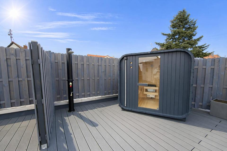 Ein besonderes Augenmerk lag auf der Neugestaltung der Außenbereiche: Die großzügige Dachterrasse wurde zu einem hochwertigen Wellness- und Freizeitbereich ausgebaut. Hier befinden sich eine Sauna, eine stilvolle Außendusche sowie eine voll ausgestattete Outdoor-Küche, die sowohl für entspannte Stunden als auch für gesellige Abende ideal geeignet ist. Ergänzt wird dies durch eine zweite, geschützte Terrasse, die zusätzlichen Platz für Aufenthalt im Freien bietet.