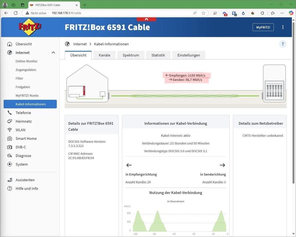 Internetanschluss ist über Vodafone Kabel mit bis zu 1000 MBit/s (1 GBit/s) möglich.