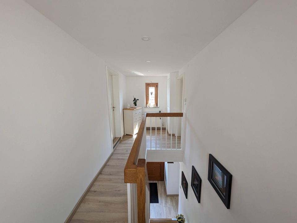 Über das modern gestaltete Treppenhaus gelangen Sie ins Obergeschoss. Dort erwartet Sie ein gemütliches Wohnzimmer, ein ruhiges Büro sowie das großzügige Badezimmer. Letzteres ist mit einer stufenlosen Dusche, einer Badewanne, einem stilvollen Waschtisch sowie zwei gegenüberliegenden Fenstern ausgestattet – viel Tageslicht und angenehme Atmosphäre inklusive. Ein zusätzlicher Zugang vom Treppenhaus aus führt direkt in den Gartenbereich – ideal für entspannte Stunden im Freien oder den schnellen Weg ins Grüne.