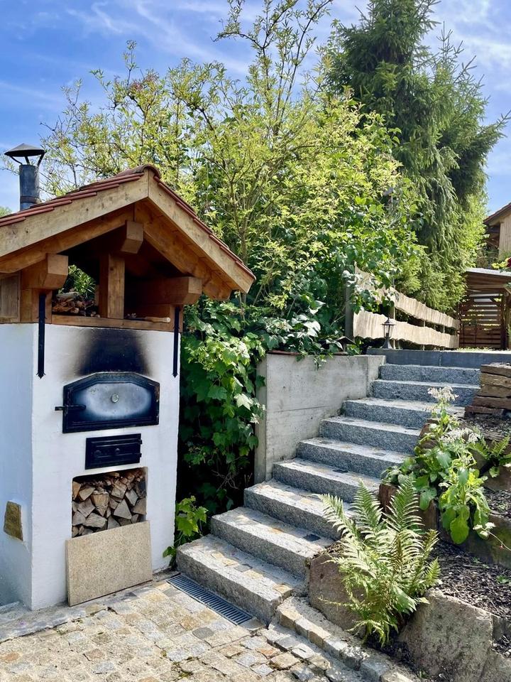 Eine Holzleg für das Verstauen Ihres Brennholzes ist ebenerdig zum Wohnzimmer vorhanden. Oberhalb der Hauptterrasse führt eine Etage zum Erdkeller mit kleinem Grillplatzerl/Feuerstelle, und abgerundet wird die Immobilie durch das 2024 fertiggestellte, maßgerfertigte Gartenhaus. Dieses können Sie entweder als Werkstatt oder als kleine Garage nutzen.