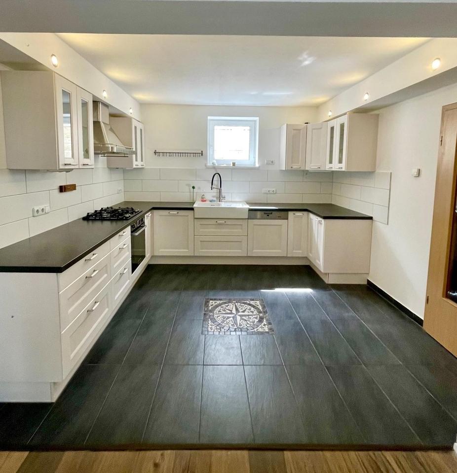 Eine große, helle Einbauküche mit Gasherd (Kaiser), Dunstabzug, großem Waschbecken, Spülmaschine (Miele) und tollem Platzangebot erwartet sie.