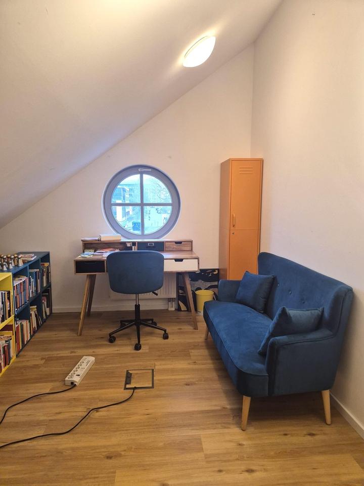 Unser Dachgeschoss wurde 2024 umfassend renoviert und bietet viel Raum zum Denken, Arbeiten und Austauschen. Es gibt einen großen, offenen Arbeitsbereich mit mehreren Schreibtischen, einen gemeinsamen Ess-/Meetingtisch, zwei abschließbare Räume, ein Bad mit Dusche sowie eine voll ausgestattete Küche. Schnelles, stabiles Internet ist selbstverständlich – Monitore und Tastaturen stehen nach Verfügbarkeit ebenfalls zur Mitnutzung bereit.