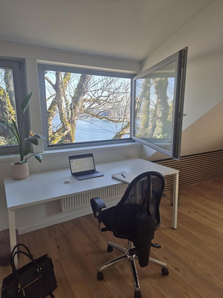 1.Ein wunderschöner Schreibtisch mit Seeblick in unserem 3–4 Personen Co-Working-Bereich