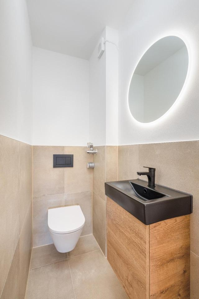 Das großzügige Badezimmer wurde modern und komfortabel gestaltet. Ein besonderes Highlight ist der barrierefreie, fugenlose Übergang zur Dusche, der sowohl optisch als auch funktional überzeugt. Die großzügige Regendusche sorgt für hohen Duschkomfort. Zudem verfügt das Bad über zwei hochwertige Waschtische, einen beleuchteten Spiegel sowie einen Waschmaschinenanschluss im großen Badezimmer. Der hochwertige Bodenbelag fügt sich harmonisch in das Gesamtbild ein.