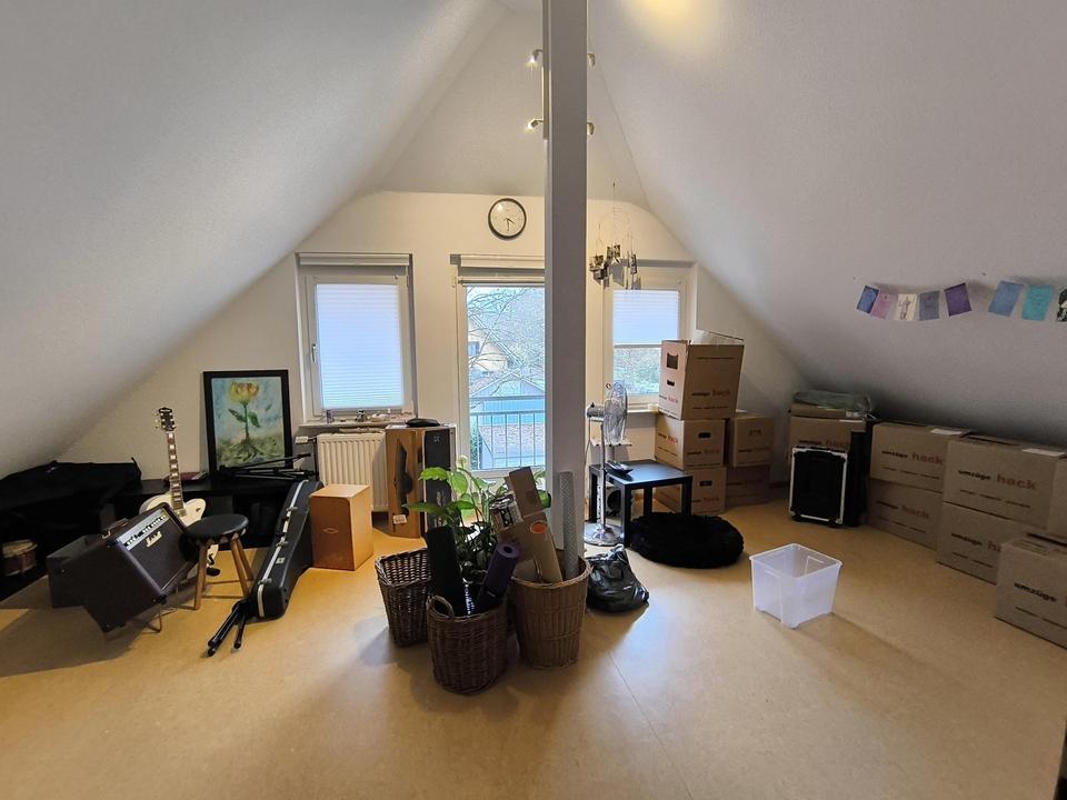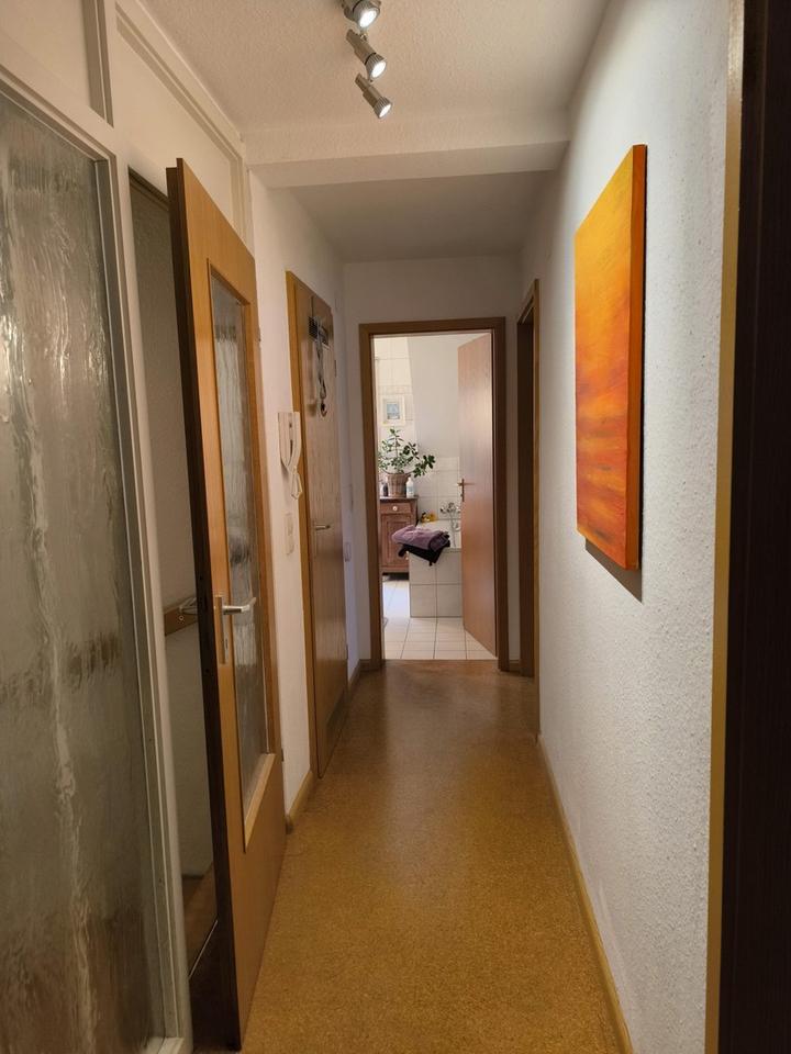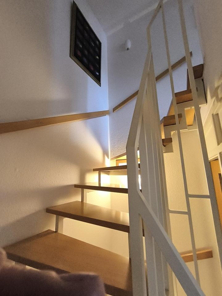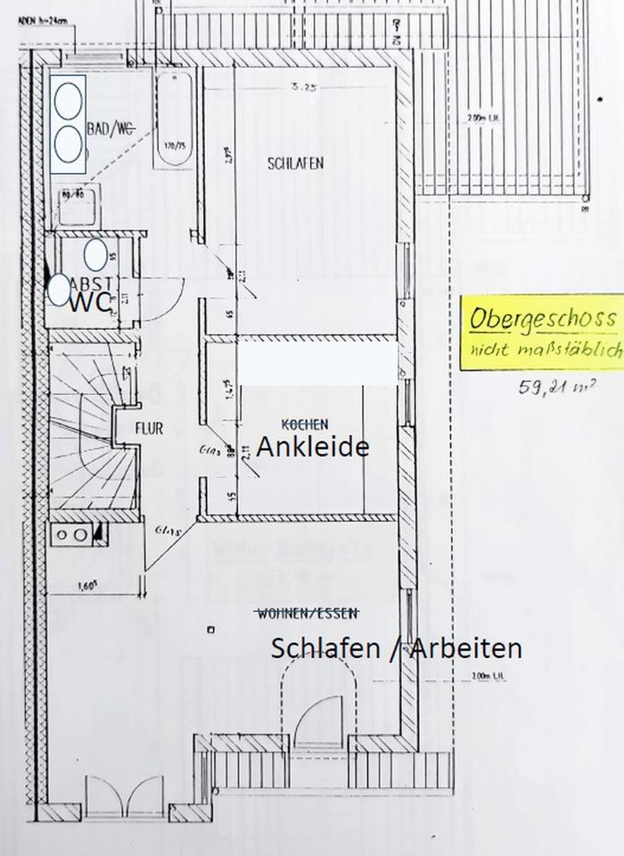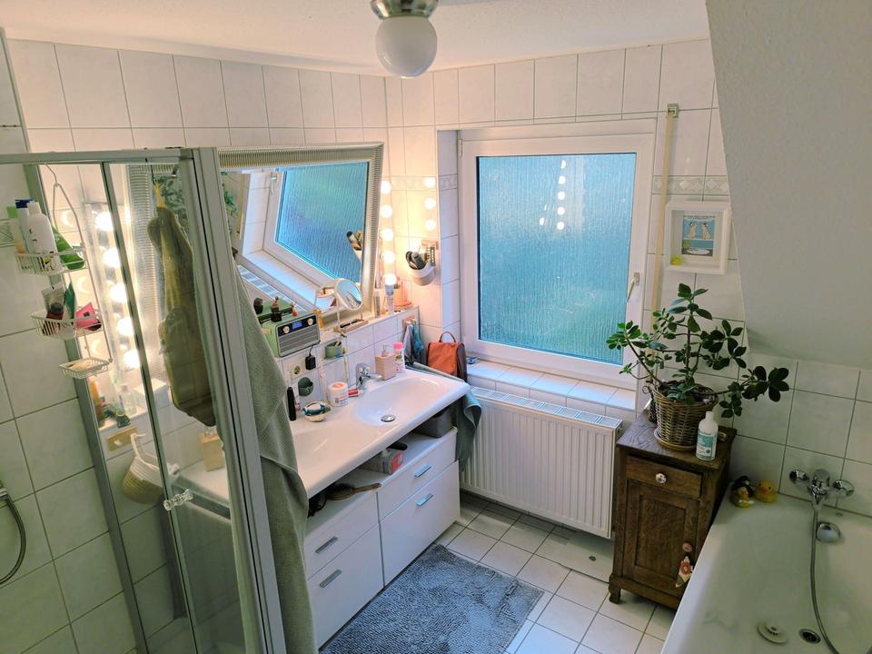 Korkfussboden im OG. Der kleinere der drei Schlafräume im OG hat an der linken Wand vorbereitete Küchenanschlüsse (wurden nie genutzt). Dort befindet sich die Bosch-Smart-Home-Steuerungseinheit für die Funkfernsteuerung sämtlicher Heizkörperthermostate im Haus. Das Badezimmer ist hell gefliest, verfügt über ein großes Doppelwaschbecken, Badewanne und separate Dusche.