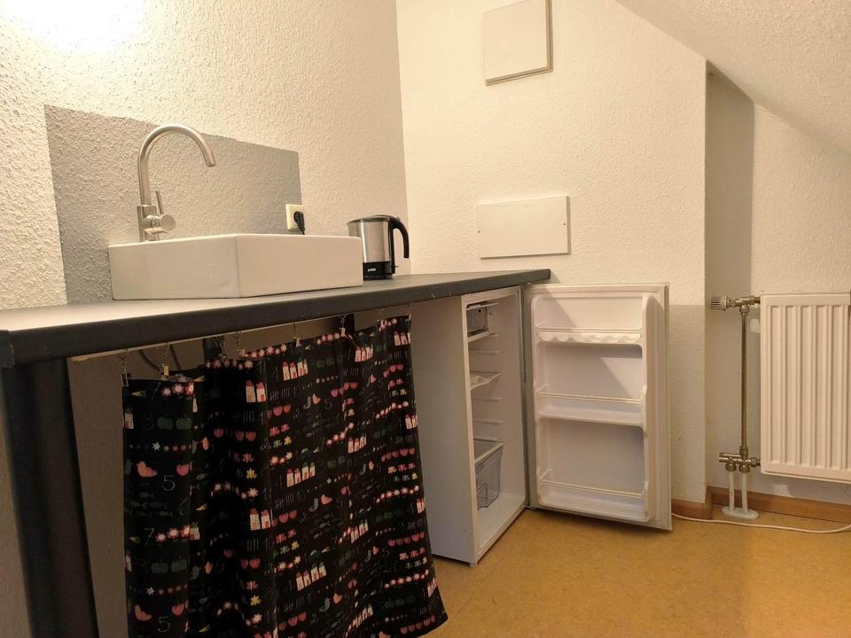 Linoleumfussboden im DG-Studio. Dort befindet sich eine kleine Teeküche mit Kühlschrank.