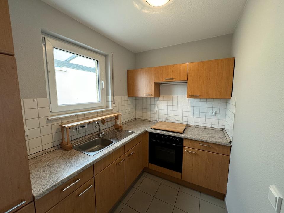 Die kompakte Einbauküche grenzt ans Wohnzimmer an und bietet reichlich Stauraum für kulinarische Abenteuer im Alltag.