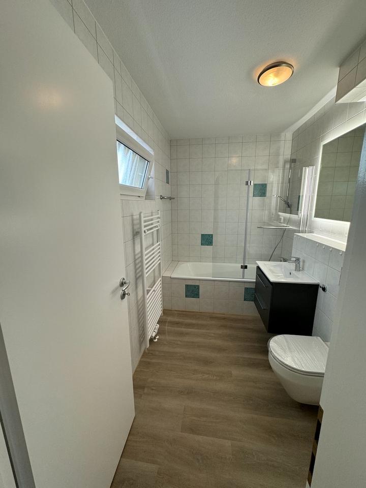 Das Tageslichtbadezimmer mit Badewanne, WC und Waschbecken erfüllt alle Morgenrituale – alles griffbereit für pure Bequemlichkeit.
